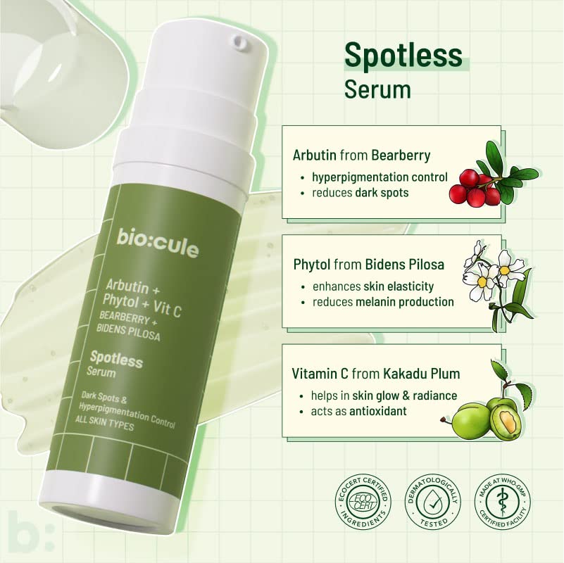 biocule Spotless Vitamin C Face Serum Arbutin Phytol & Vitamin C from Bearberry Bidens Pilosa & Kakadu Plum for Hyperpigmentation Dark Spots Freckles & Blemishes Light Gel for All Skin Types- 15ml