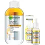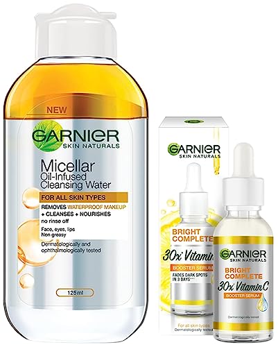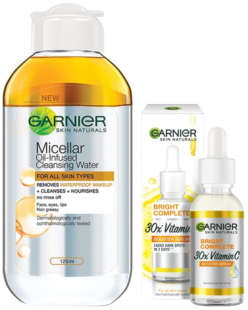 Garnier Skin Naturals Face Serum Increases Skin's Glow Instantly and Reduces Spots Overtime Bright Complete Vitamin C Booster 30 mlBright Complete Vitamin C Booster Face Serum is Garnier's most concentrated brightening formula yet. Compared to our day cream this serum is enriched with 30 times the amount of Vitamin C! Together with the lemon extract this lightweight non-oily formula penetrates the skin to instantly increase its glow as well as reduce dark spots in 3 days* - all in a safe and natural way! (* According to clinical tests)Garnier Skin Naturals Cleansing Water for Waterproof Makeup Nourishing Formula Micellar Oil-Infused Cleansing Water 125mlGarnier Micellar Oil-Infused Cleansing Water is a make-up remover that removes make-up and other impurities from your skin easily. It is enriched with cleansing molecules called Micelles that attract make-up and other impurities lifting them away from your pores â just like a magnet. No rubbing is needed. How to use â Shake the bottle pour it onto cotton press lightly on the skin for a few seconds and wipe away gently. The proof is on the cotton. Garnier Micellar Oil-Infused Cleansing Water is perfect for heavy and waterproof make-up. If lighter make-up is more your style you can try Garnier Micellar Cleansing Water.