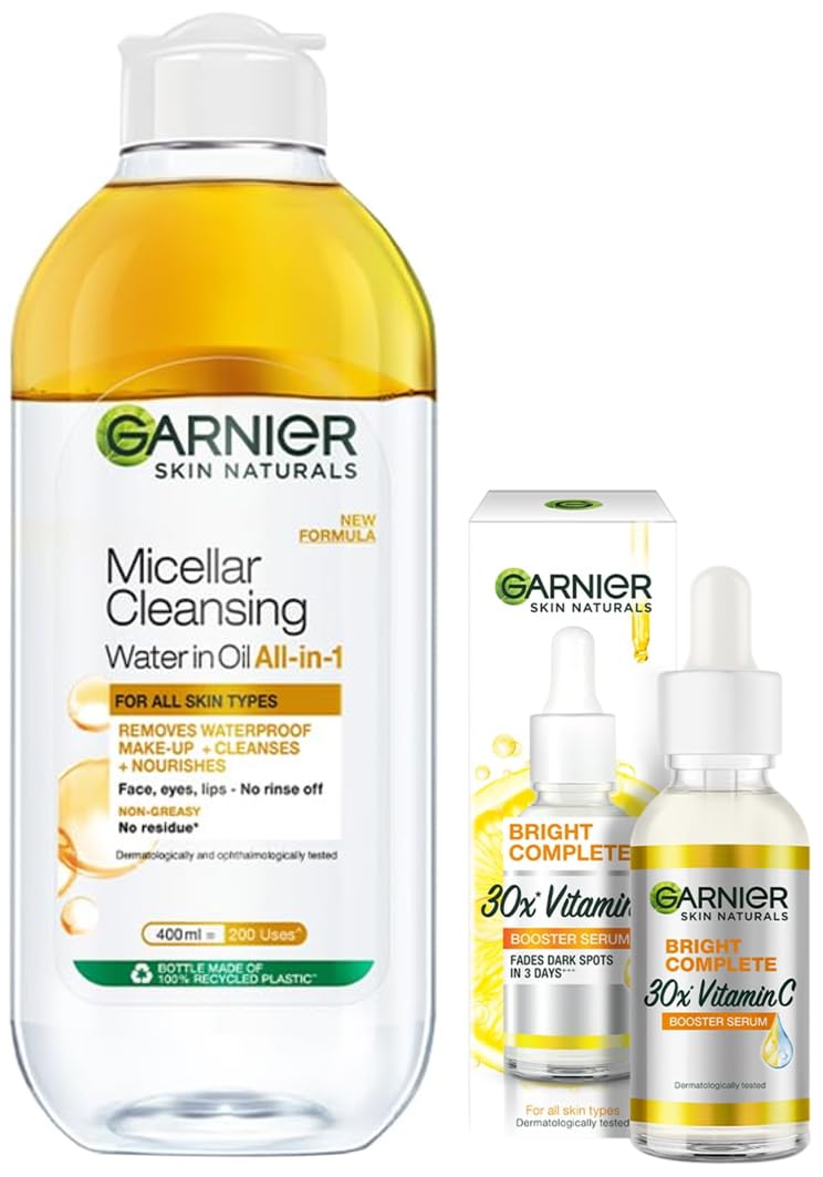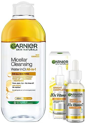 Garnier Skin Naturals Face Serum Increases Skin's Glow Instantly and Reduces Spots Overtime Bright Complete Vitamin C Booster 30 mlBright Complete Vitamin C Booster Face Serum is Garnier's most concentrated brightening formula yet. Compared to our day cream this serum is enriched with 30 times the amount of Vitamin C! Together with the lemon extract this lightweight non-oily formula penetrates the skin to instantly increase its glow as well as reduce dark spots in 3 days* - all in a safe and natural way! (* According to clinical tests)Garnier Skin Naturals Cleansing Water for Waterproof Makeup Nourishing Formula Micellar Oil-Infused Cleansing Water 400mlGarnier Micellar Oil-Infused Cleansing Water is a make-up remover that removes make-up and other impurities from your skin easily. It is enriched with cleansing molecules called Micelles that attract make-up and other impurities lifting them away from your pores â just like a magnet. No rubbing is needed. How to use â Shake the bottle pour it onto cotton press lightly on the skin for a few seconds and wipe away gently. The proof is on the cotton. Garnier Micellar Oil-Infused Cleansing Water is perfect for heavy and waterproof make-up. If lighter make-up is more your style you can try Garnier Micellar Cleansing Water.