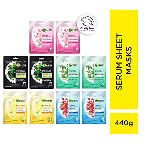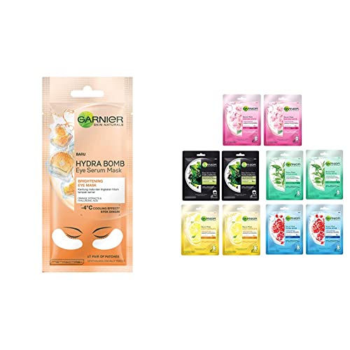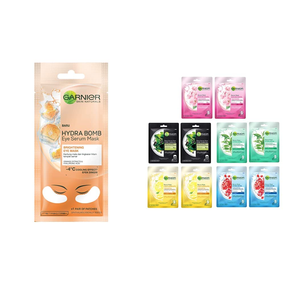 Garnier Hydra Bomb Eye Serum Mask Orange 6 gGarnier Hydra Bomb Eye Serum Mask (Orange) helps reduce eye bags and dark circles to give you awake fresh brighter-looking eyes! For tired and dull eye contours this tissue mask enriched with orange juice and hyaluronic acid will leave the eye area looking brighter more refreshed and more awake. PROVEN EFFICACY: Intensely hydrates and reduces appearance eye of bags. Eye area will feel refreshed and revitalized leaving a cooling effect on your skin. For extra-cooling sensation keep in the fridge. How to use 1. To apply take it out and unfold the mask. Separate the patches from the protective film. 2. Gently apply the patches on cleansed skin. Smooth the mask gently to ensure contact with the skin adjusting the patches to the targeted under eyes. 3. Leave for 15 minutes. Remove the mask. Gently massage any excess serum into the skin.Garnier Skin Naturals Face Serum Sheet Mask 437g - Pack of 10 (2 Each of Light Complete Charcoal Sakura and Hydra Bomb )Garnier introduces a new generation of face masks for women that infuses skin with 1 week of serum with 1 mask. Garnier serum sheet masks gives your skin super hydration in just 15 mins and brightens it instantly.