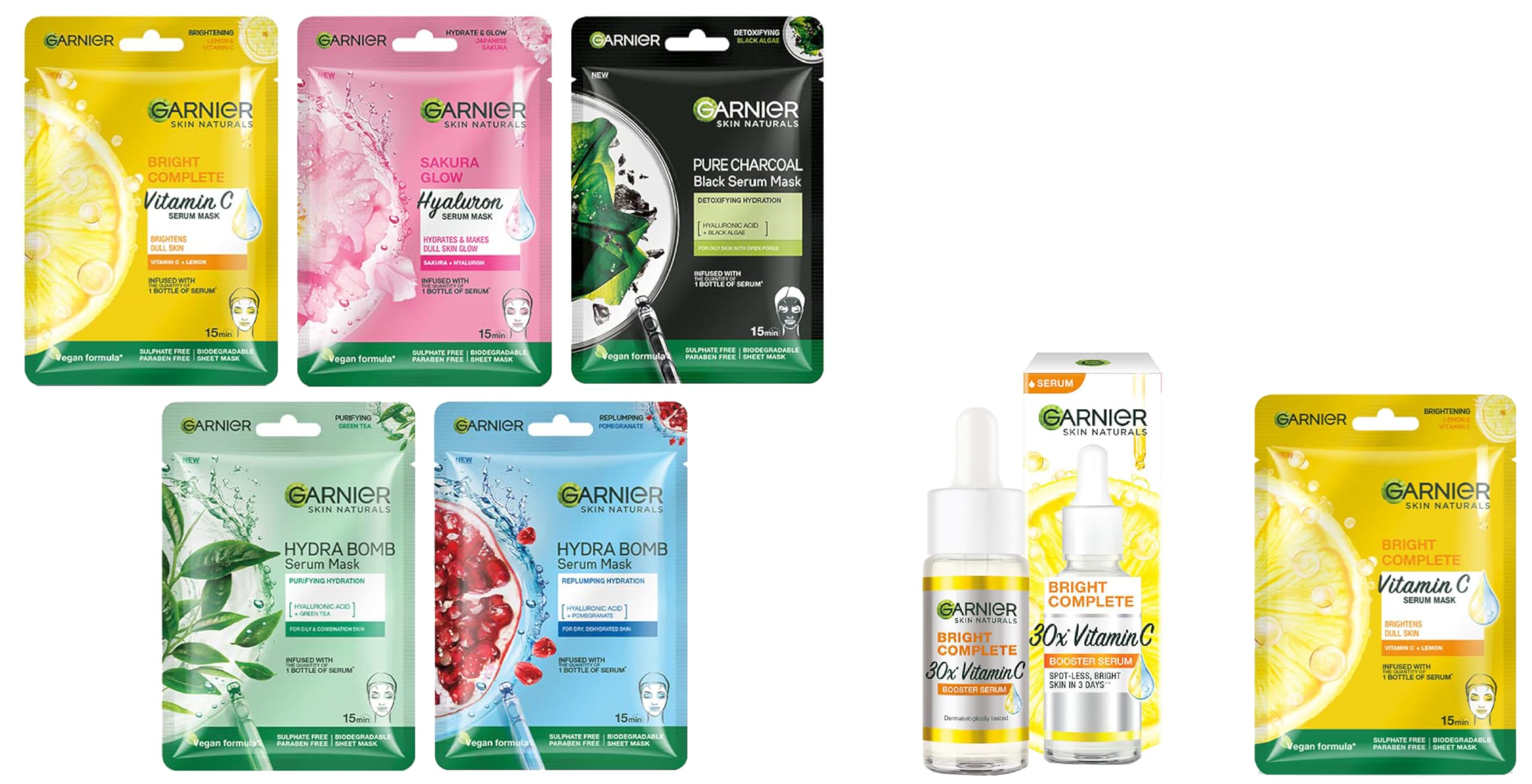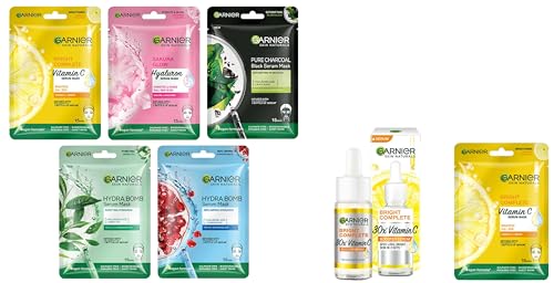 Garnier Skin Naturals Face Mask Set Hydrating Pore Reducing Brightening and Enhances Glow Hydra Bomb Serum Mask & Black Serum Mask 5 pcs 140gGarnier Sheet Masks give your skin a facial-like glow in just 15 mins and helps brighten it instantly. The sheet masks are a breakthrough technology that offers hydrating efficacy with natural ingredients. The sheet mask has been dermatologically tested. Suitable for all skin types including sensitive skinGarnier Skin Naturals Face Serum Brightening and Anti-Dark Spots Bright Complete Vitamin C Booster 15 mlBright Complete Vitamin C Booster Face Serum is Garnier's most concentrated brightening formula yet. Compared to our day cream this serum is enriched with 30 times the amount of Vitamin C! Together with the lemon extract this lightweight non-oily formula penetrates the skin to instantly increase its glow as well as reduce dark spots in 3 days* - all in a safe and natural way! (* According to clinical tests)Garnier Skin Naturals Face Mask Hydrating Brightening & Anti-Dark Spots Bright Complete 1 pc 28gIntroducing Garnier's new generation of sheet masks for the face and eye area Hydra Bomb. All of these masks have one thing in common: they hydrate the skin with one week's worth of serum within just 15 minutes. Different types of the face masks are also enriched with other ingredients to provide more specialised solutions for issues different skin types may face. For example this type of mask is aimed at women with a dull skin tone: the mask contains ingredients such as lemon and Vitamin C which enhance the skin's natural glow. Naturally all masks in the series are dermatologically tested and suitable for sensitive skin as well.