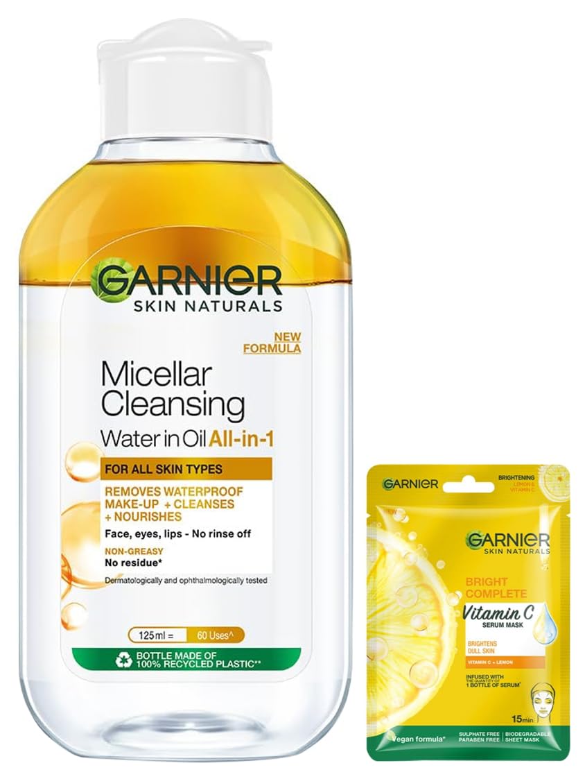Garnier Skin Naturals Cleansing Water for Waterproof Makeup Nourishing Formula Micellar Oil-Infused Cleansing Water 125mlGarnier Micellar Oil-Infused Cleansing Water is a make-up remover that removes make-up and other impurities from your skin easily. It is enriched with cleansing molecules called Micelles that attract make-up and other impurities lifting them away from your pores â just like a magnet. No rubbing is needed. How to use â Shake the bottle pour it onto cotton press lightly on the skin for a few seconds and wipe away gently. The proof is on the cotton. Garnier Micellar Oil-Infused Cleansing Water is perfect for heavy and waterproof make-up. If lighter make-up is more your style you can try Garnier Micellar Cleansing Water.Garnier Skin Naturals Face Mask Hydrating Brightening & Anti-Dark Spots Bright Complete 1 pc 28gIntroducing Garnier's new generation of sheet masks for the face and eye area Hydra Bomb. All of these masks have one thing in common: they hydrate the skin with one week's worth of serum within just 15 minutes. Different types of the face masks are also enriched with other ingredients to provide more specialised solutions for issues different skin types may face. For example this type of mask is aimed at women with a dull skin tone: the mask contains ingredients such as lemon and Vitamin C which enhance the skin's natural glow. Naturally all masks in the series are dermatologically tested and suitable for sensitive skin as well.