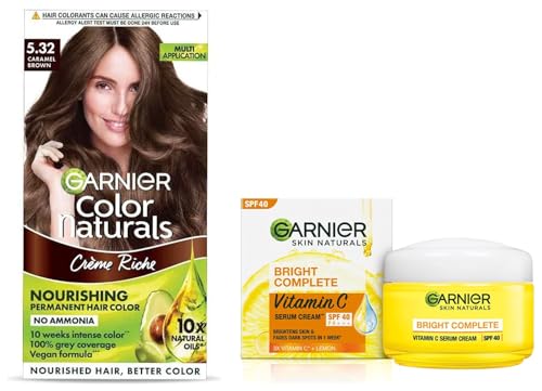 Garnier Skin Naturals Day Cream Brightening & Protects Skin from Sun Bright Complete Vitamin C Serum Cream 45 gWant your face to shine as brightly as the sun? This serum cream is quickly absorbed by the skin and enriched with yuzu lemon and a high concentration of Vitamin C - thrice as high as Garnier's Sakura White Serum Cream in fact - to combat dullness in the skin. This means that dark spots are noticably reduced and that your over all skin tone becomes brighter than ever. The SPF 40 and PA+++ in this face cream also protect your skin from the damage caused by harsh sun rays such as skin tanning spots and sunburn.Garnier Hair Colouring Creme Long-lasting Colour Smoothness & Shine Color Naturals Shade: 5.32 Caramel Brown 70ml + 60gGive your hair a natural shade in the comfort of your own home with Garnier Color Naturals. The creamy hair colour gives 100% grey coverage and is available in several impressive shades. The ammonia free formula ensures that your new colour lasts up to 8 weeks* and has also been enriched with almond olive and avocado oil to nourish the hair and increase its shine. The Color Ready Kit makes sure that you have all the required equipment ready and includes a bowl brush and hair clips. (*Note: We recommend using a colour protect shampoo and conditioner to ensure that the colour lasts that long. Also be aware that even if the formula is free from ammonia other ingredients could irritate the skin. Therefore always do an allergy test 24 hours before colouring your hair!)