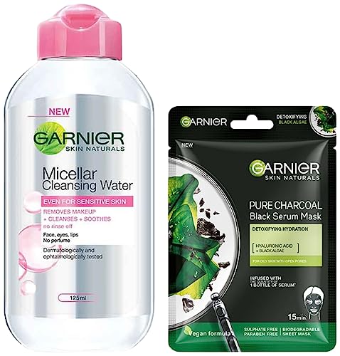 Garnier Skin Naturals Micellar Cleansing Water 125mlGarnier Micellar Cleansing Water is a make-up remover and cleanser that removes make-up and other impurities from your skin easily. It is enriched with cleansing molecules called Micelles that attract impurities lifting them away from your pores â just like a magnet. No rubbing is needed. How to use â Pour some micellar water onto a cotton pad press lightly on the skin for a few seconds swipe away gently. Proof is on the cotton. Garnier Micellar Cleansing Water is perfect for everyday make-up. If heavy and waterproof make-up is more your style try the Garnier Micellar Oil Infused Cleansing Water.Garnier Skin Naturals Charcoal Face Serum Sheet Mask (Black) 28gGarnier introduces a new generation of face masks for women that infuses skin with 1 week of serum with 1 mask. Garnier black serum mask is a breakthrough black tissue mask technology that offers double purifying and hydrating efficacy. Use Garnier black serum mask if you have dull skin with clogged and enlarged pores. It is enriched with charcoal known for its ability to remove impurities. It is also enriched with pore tightening black algae extracts. The serum mask will intensely hydrate and purify your skin while also tightening its pores. The sheet mask has been dermatologically tested.