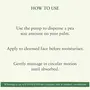• How to use: 1. Use the pump to dispase a pea size amount on your palm; 2. Apply to cleansed face before moisturiser; 3. Gently massage in circular motion until absorbed