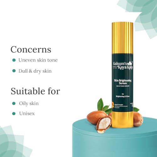 Kulsum's Kaya Kalp Herbals Skin Brightening Serum is a perfect blend of ayurvedic ingredients that help illuminate the skin. It is enriched with aloe vera pumpkin seed oil carrot seed oil olive oil jojoba oil and argan oil. Skin Brightening Serum contains aloe vera that helps moisturise the skin without making it greasy. It also contains antimicrobial and anti-inflammatory properties. It also helps with skin blemishes. Pumpkin seed oil helps boost the production of collagen and maintains skin's youthfulness. Carrot seed oil helps rejuvenate the skin. Olive oil a potent antioxidant helps protect and hydrate even the most sensitive skin. It helps revitalise and strengthen skin's tonicity. Jojoba oil is high in antioxidants including vitamins A and E as well as omega-6 fatty acids which are vital components of the skin's barrier. Its anti-inflammatory benefits help provide the even tone while providing the hydration it needs to restore itself. Argan oil provides hydration to the skin thanks to its high quantities of vitamin E.