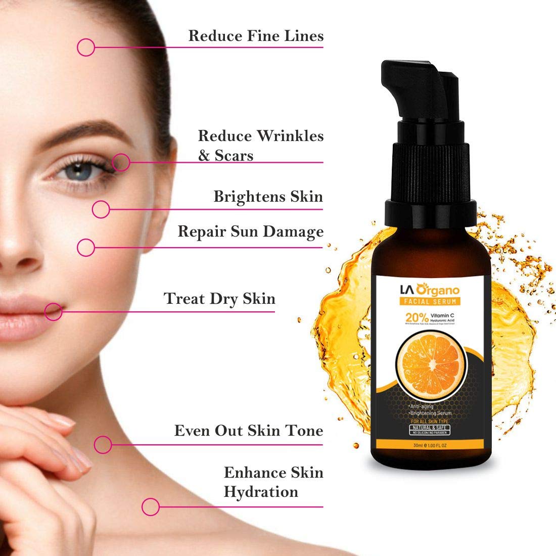 HomeHealth & PersonalSkin CareFace CareSerum & LotionLA Organo Vitamin C Face Serum Anti-Aging Formula for Face Glowing Skin Brightening and Lightening -Reduce Wrinkle Dark Circles Fine Lines Sun Damage 30 ml (Pack of 1)