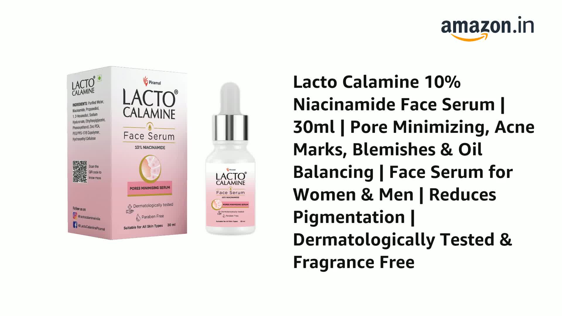 Lacto Calamine 10% Niacinamide Face Serum | 30ml | Pore Minimizing, Acne Marks, Blemishes & Oil Balancing | Face Serum for Women & Men | Reduces Pigmentation | Dermatologically Tested & Fragrance Free