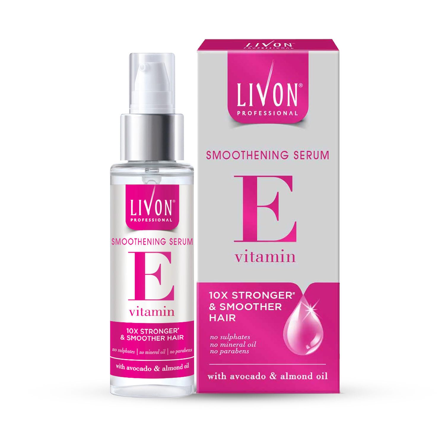 Presenting the all-new Livon Professional Smoothening Serum: Experience glamorous smooth & silky hair with Livon Professional Smoothening Serum. It provides 10x Stronger* & Smoother hair with the miraculous power of Vitamin E. Specially designed for all hair types & chemically treated hair. Enriched with the essential formula of Vitamin E & infused with other ingredients like Avocado & Almond Oil this Smoothening Serum repairs damaged hair making them smooth strong glossy & silky. Vitamin E repairs hair and reverses signs of damage making hair smooth & silky. Avocado oil deeply nourishes the hair by penetrating inside and forms a protective layer sealing hair cuticle strengthening the flexibility of hair & enhancing the resistance against breakage. Almond Oil softens & moisturizes hair providing elasticity to the hair strands making hair strong. This serum is also devoid of any harmful chemicals such as parabens sulphates or mineral oil. Its lightweight non-sticky and non-greasy formula makes it suitable for detangling & reducing frizz without weighing the hair down. *Basis Hair Breakage Study vs Untreated Hair 2023
