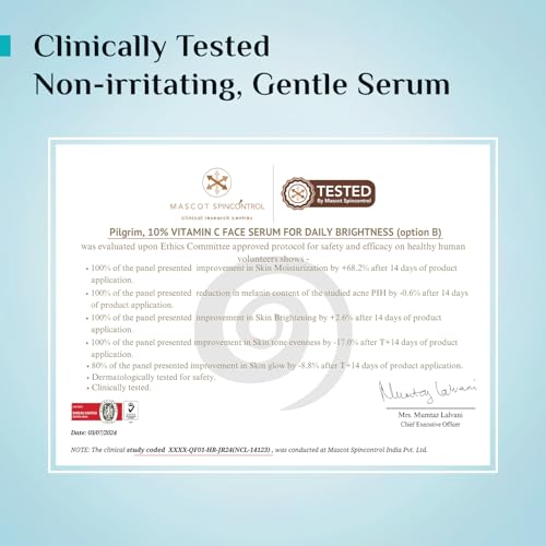 10% VITAMIN C SERUM: This serum is the perfect facecare product to deliver glowing brighter skin in 5 days when consistently used. GLOWING BRIGHTER SKIN IN 5 DAYS: Clinically tested: 10% Vitamin C and 5% Niacinamide delivers glowing brighter skin in 5 days. REDUCES DARK SPOTS IN 3 DAYS: Powerful combination of 10% Vitamin C and 5% Niacinamide helps reduces Dark Spots in 3 Days. EVENS SKIN TONE: A perfect beginner-friendly serum this 10% Vitamin C serum fades discolourations to even skin tone. STABLE FORM OF VITAMIN C: The naturally occurring form of vitamin C is highly unstable so there is a skincare hero which is a derivative of Vitamin C known as 3-O-Ethyl ascorbic acid.