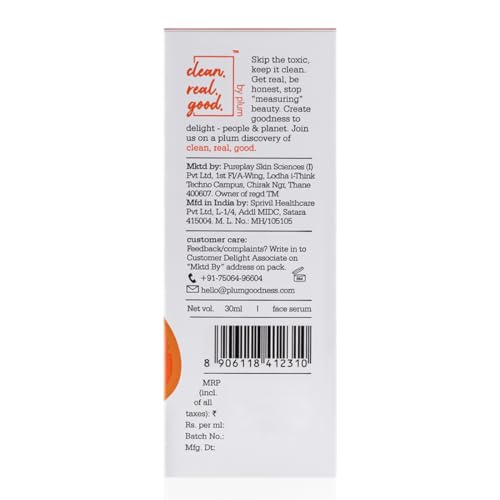 I recently incorporated the Plum 15% Vitamin C Face Serum into my skincare routine, and I must say, I am thrilled with the results.Firstly, I love the lightweight and non-greasy texture of this serum. It absorbs quickly into the skin, leaving it feeling hydrated and smooth. The 15% Vitamin C concentration is potent enough to make a noticeable difference in my skin's brightness and overall appearance.I also appreciate that this serum is free from harmful chemicals like parabens, phthalates, and sulfates. Knowing that I'm using a clean and cruelty-free product gives me peace of mind.After using this serum for a few weeks, I noticed a significant improvement in my skin's texture and tone. My complexion looked more even, and my skin appeared brighter and more radiant. Additionally, I have sensitive skin, and I'm happy to report that this serum did not cause any irritation or breakouts.