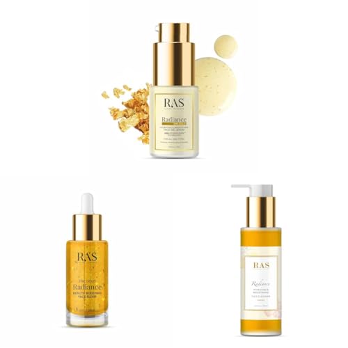 RAS Luxury Oils Radiance 24K Gold Brightening 8 in 1 Face Gel Serum Hydrates Skin & RAS Luxury Oils 24K Gold Radiance Beauty Boosting Face Elixir Serum & RAS Luxury Oils Radiance Hydrating & Brightening Face Wash; Enriched With Saffron, Rose & Orange Peel