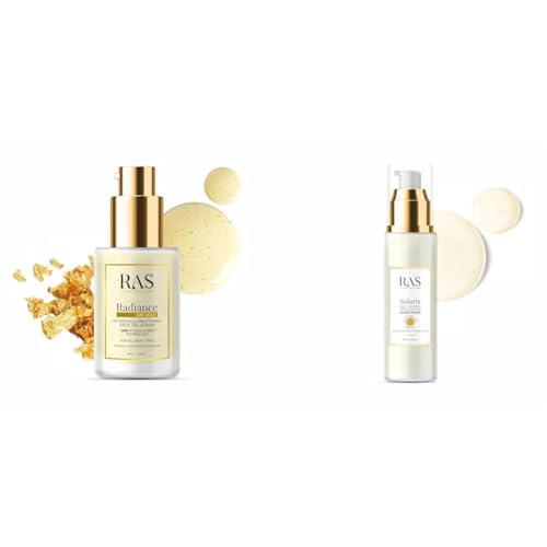 RAS Luxury Oils Radiance 24K Gold Brightening 8 in 1 Face Gel Serum Hydrates Skin & RAS Luxury Oils Solaris Daily Defence Sunscreen Combo