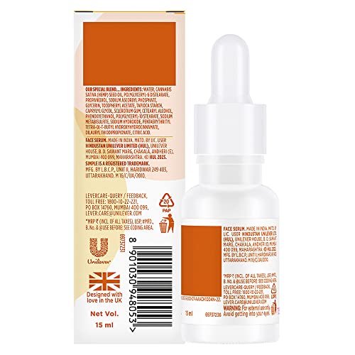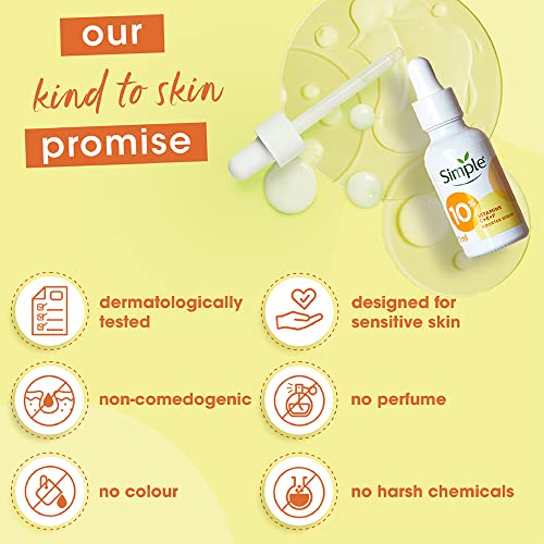 Supercharge your skincare routine with the NEW Simple Booster Serum - 10% Vitamin C+E+F. This serum is potent yet kind Serum is our most advanced innovation yet and works best for youthful glowing skin. The formulation has 2% active vitamin C derivative more stable than ascorbic acid yet not irritating that brightens skin and provides antioxidant protection 1% active vitamin E further boosting effectiveness of vitamin C that nourishes skin and helps boosts effectiveness of Vitamin C and 7% active Vitamin F that moisturises and strengthens skin barrier. Vitamin C+E+F Serum is 95% naturally derived 91% biodegradable that's non greasy and non-sticky and feels absolutely light on skin Like all other Simple products the booster serums contains no colour or dye no alcohol no parabens no mineral oil and no artificial perfume. We're dermatologically tested and approved and ophthalmologically tested. Specially designed for sensitive skin users we're tested and approved hypoallergenic and non-comedogenic. At Simple we're all about Clean Beauty with 100% efficacy! And it's really SIMPLE â no skin irritants only skin loving ingredients as we know what we leave out of our products is just as important as what we put in! In fact we only include ingredients that downright love your skin and respect its natural balance and build it further. Because all skin can be sensitive at times; pollution stress irritants changing weather lack of sleep and city living there's a million reasons why your skin can feel a little sensitive and need the extra care and kindness. And we believe Clean Beauty is Simple even for sensitive skin!