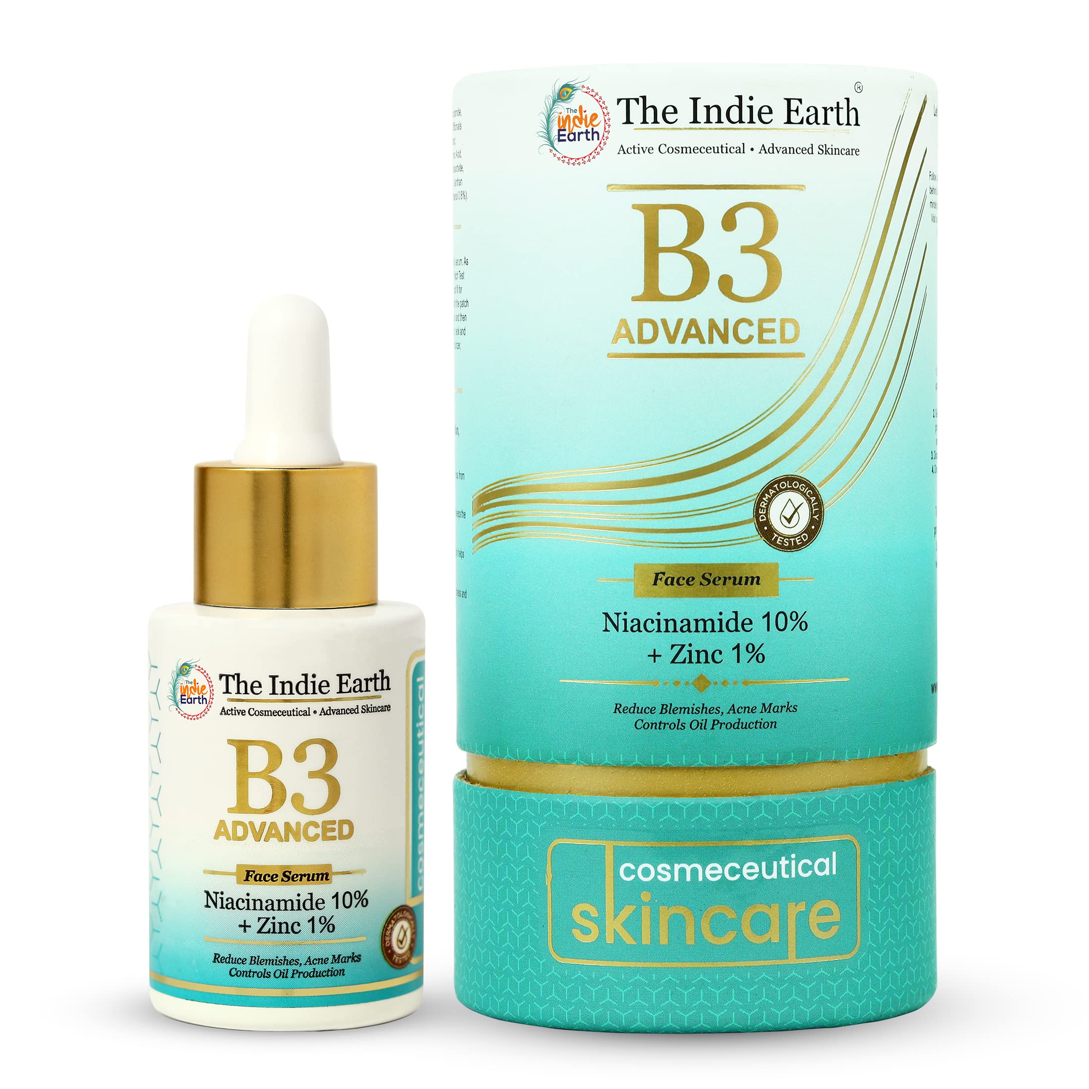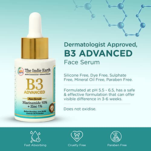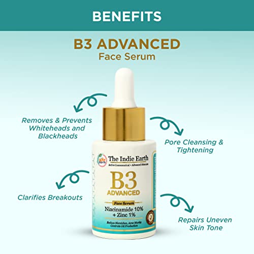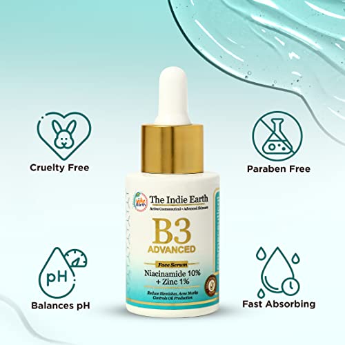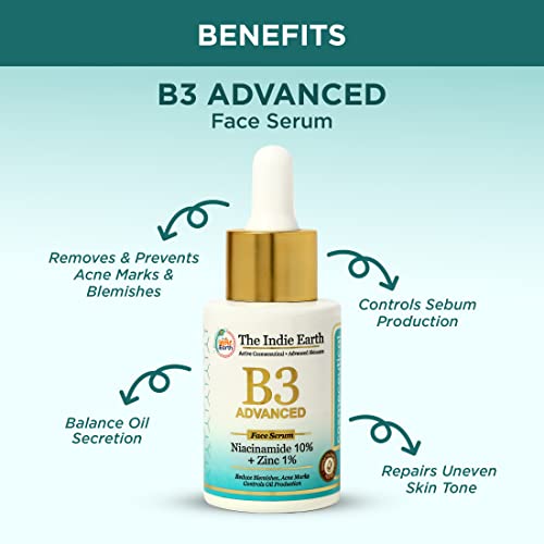 SAY HELLO TO CLEAN & TRANSPARENT BEAUTY: The Indie Earth B3 Advanced Niacinamide 10% & Zinc 1% Face Serum is a Dermatologically Tested Non-Comedogenic & Oil-Free Face Serum. It is also 100% Fragrance-free | Mineral oil-free | Artificial perfume-free | Silicones-free | | Parabens-Free | Essential Oils-free and Dyes-free. Formulated at pH 5.5 - 6.5 has a safe & effective formulation that can offer visible difference in 3-6 weeks. REMOVES & PREVENTS ACNE MARKS & BLEMISHES: Niacinamide works to regulate the amount of acne-causing oil being produced by the glands in your skin. This product can effectively improve the skin defects repair the reddening skin even the rough pores balance the oil secretion reduce acne acne marks & blemishes and create the smooth and bright skin for you. No more blemishes only clear healthy skin! CONTROLS SEBUM PRODUCTION: Gives you much needed clear matt look throughout the day by balancing oil controlling sebum activity & reducing pore congestion. Highly concentrated to purify & refine the complexion. This formula helps balance excess oil production and purifies congested skin. No more enlarged pores & oily face. Ingredients: Aloe Barbadensis Leaf Juice Niacinamide Propanediol Glycerin Zinc PCA Rosmarinus Officinalis (Rosemary) Leaf Extract Centella Asiatica Extract Hibiscus Rosa-Sinensis Flower Extract Hyaluronic Acid Tocopheryl Acetate Caprylyl Glycol Dimethyl Isosorbide Ethoxydiglycol Hydroxyethylcellulose Pullulan Xanthan Gum Sclerotioum Gum Citric Acid Phenoxyethanol 0.8%).