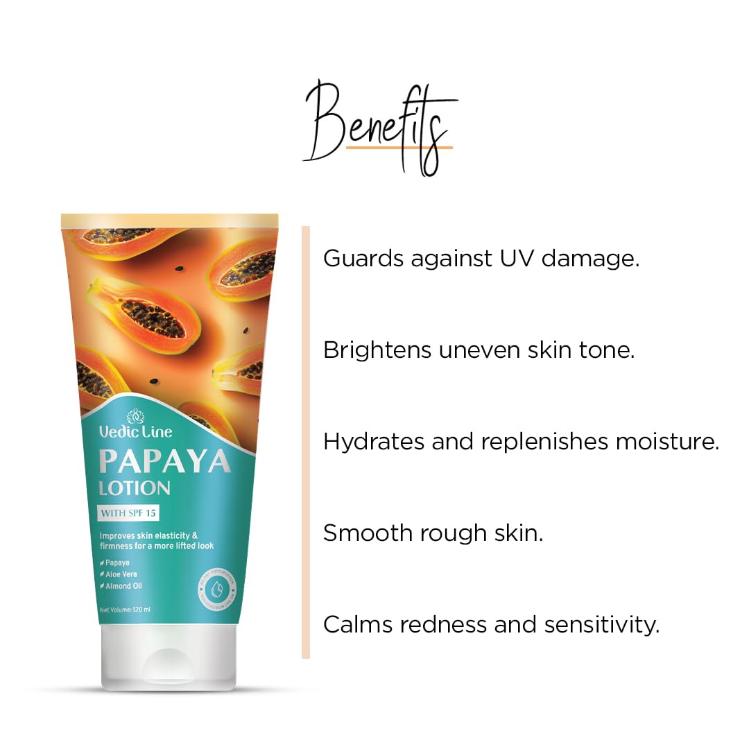 • Vedicline papaya body lotion with Spf 15 functions as a natural that protects against UVA and UVB rays. Because of the damaging effects of sunbeams it s skin tanning and provides long-lasting beauty.