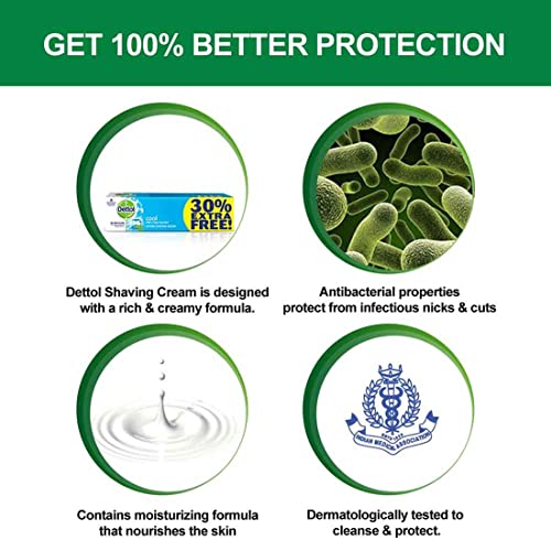 Dettol shaving cream is a rich creamy formula that softens the beard for a smooth shave. The trusted Dettol protection prevents any nicks and cuts from infections. The cream is ready-to-use and leaves skin feeling clean and smooth and better protected than other shaving creams. Also recommended by the Indian Medical Association Dettol shaving cream is 10 times better than the regular shaving creams and creams available in the market.The best tips for a closer cleaner shave:Take a warm shower or wash your face before shaving to help soften the hair and open up the pores.No one's facial hair grows in exactly the same direction. You should always shave in the same direction of the hair growth.Apply an even layer of the shaving cream across the areas to be shaved for a uniform hair removal.It's always helpful to have a fresh blade in your razor and a good quality shaving cream to make sure the razor and the shaving is clean. Shave with the grain in cartridges and rinsing often between strokes. For straight razors shave once with the grain rinse and then against the grain. For a safer shave without nicks and cuts try keeping the razor at a 30 degree angle or above. Rinse off the face with lukewarm water at first and then splash with cold water to close the pores and prevent razor bumps also promoting hair growth. Choosing the razor: Cartridge are the most prefered for their ease of use though experts suggest straight razors for a healthier and cleaner shave. Electric razors use a tug-and-cut technology which is not very good for your skin. On the other hand cartridges have a lot of friction and can cause razor rash. But straight razors and safety razors use clean cuts which are smoother on the skin and better for you. However it ultimately comes down to your personal preference and comfort used with a good quality shaving cream your shaving experience can be safe and much healthier no matter what razor you use.Dettol shaving creams serve as a protective cushion between the razor and your skin for a closer shave without irritation. It also nourishes and leaves the skin moisturized and not dry.