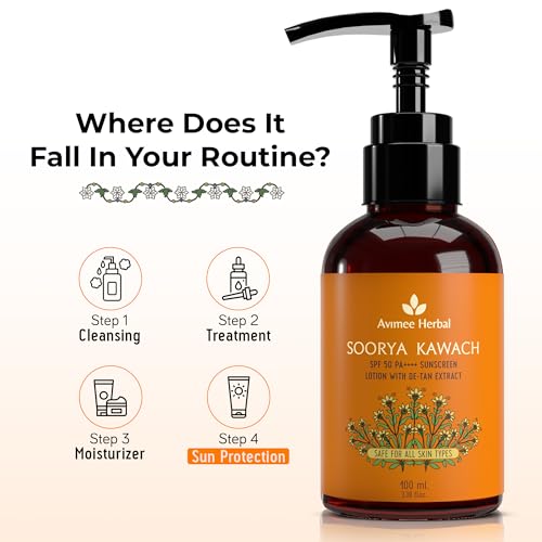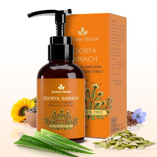 AVIMEE HERBAL Soorya Kawach Spf 50 Pa++++ Sunscreen Lotion With Vitamin C | Broad Spectrum Uva, Uvb & Blue Light Protection | For Radiant & Glowy Skin | 100 Ml For All Skin Types, 1 Count