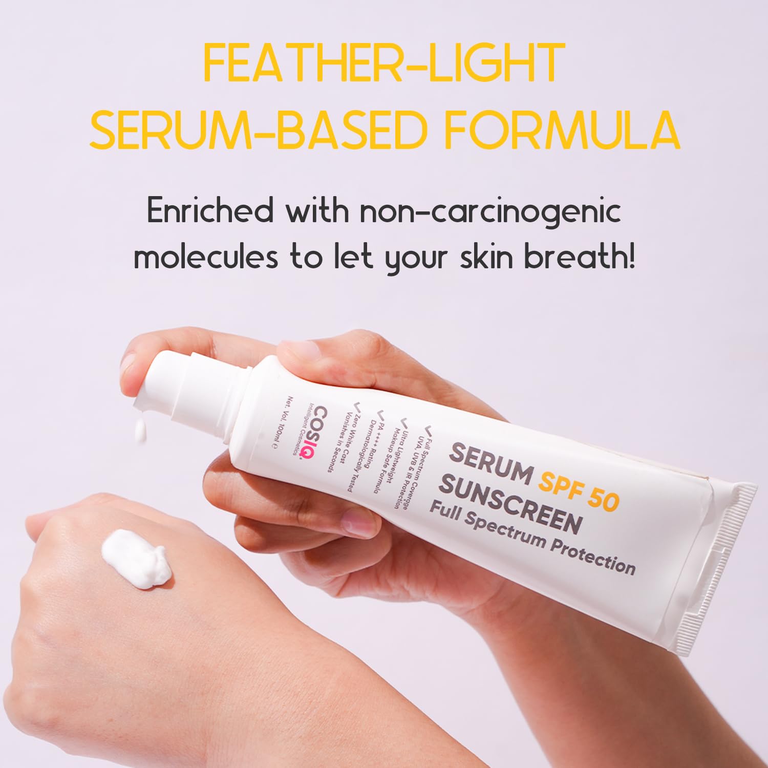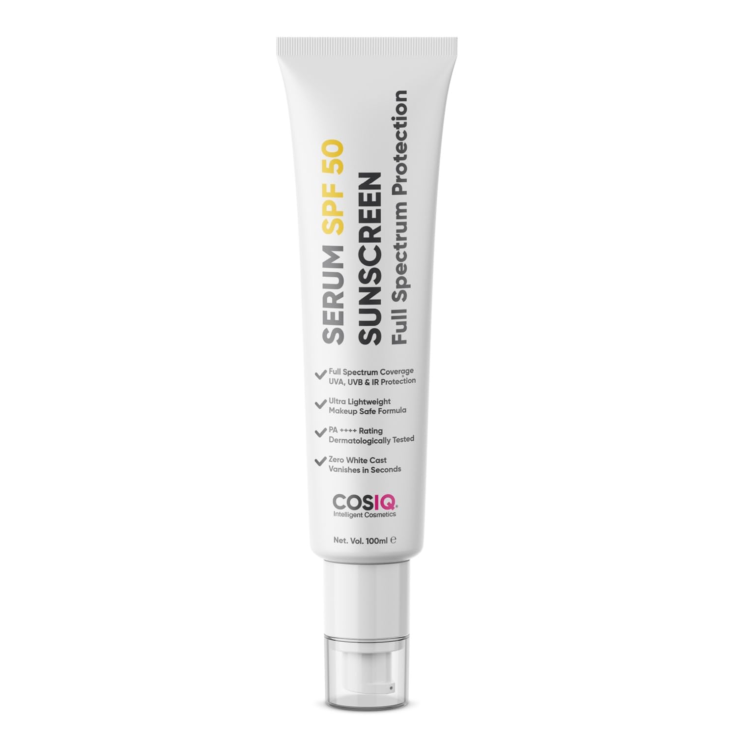 COS-IQ All Sunscreen Serum SPF 50 PA++++ Broad Spectrum UVA UVB & IR Protection No White Cast Ultra-Light Weight Skin Safe Dewy Finish For Unisex 100ml