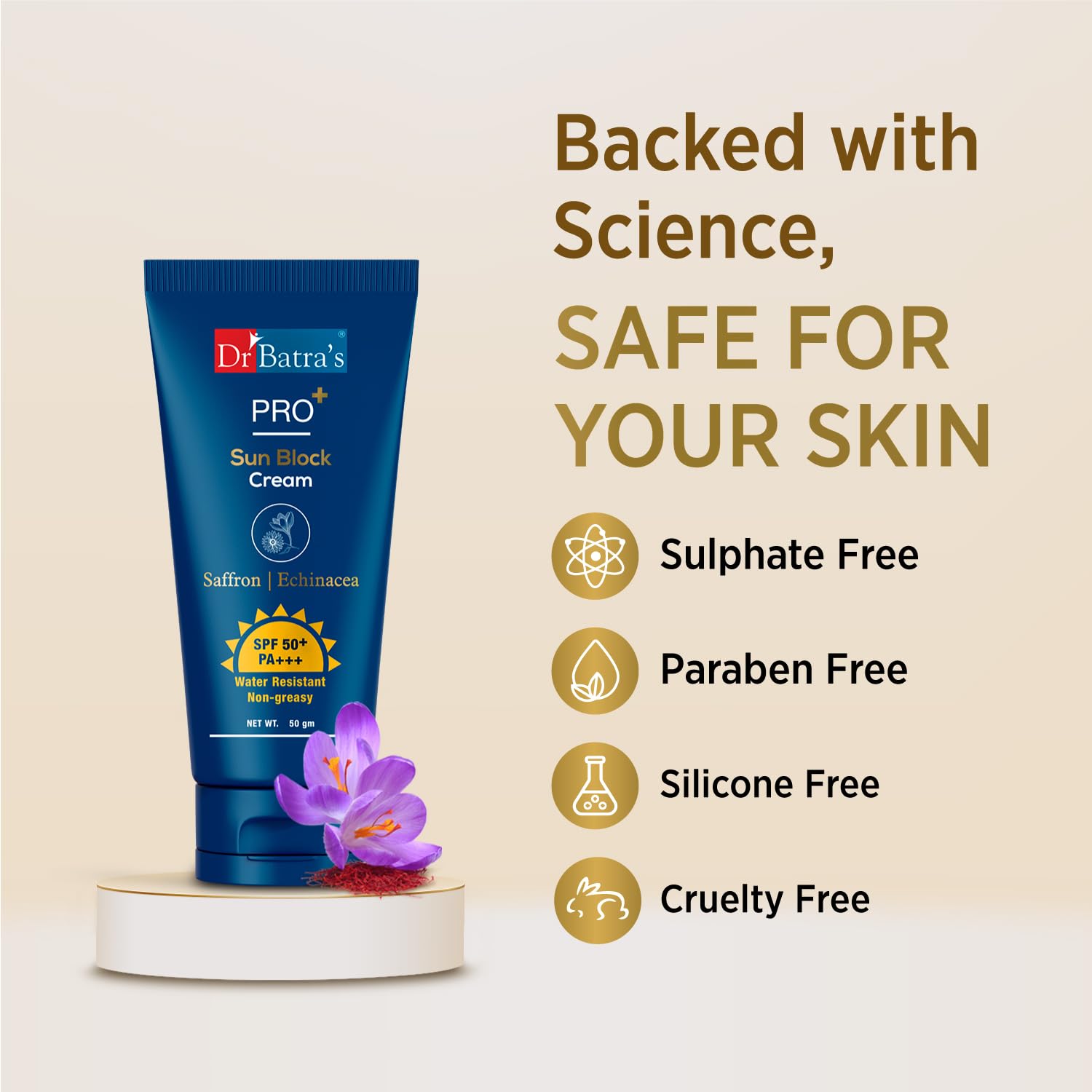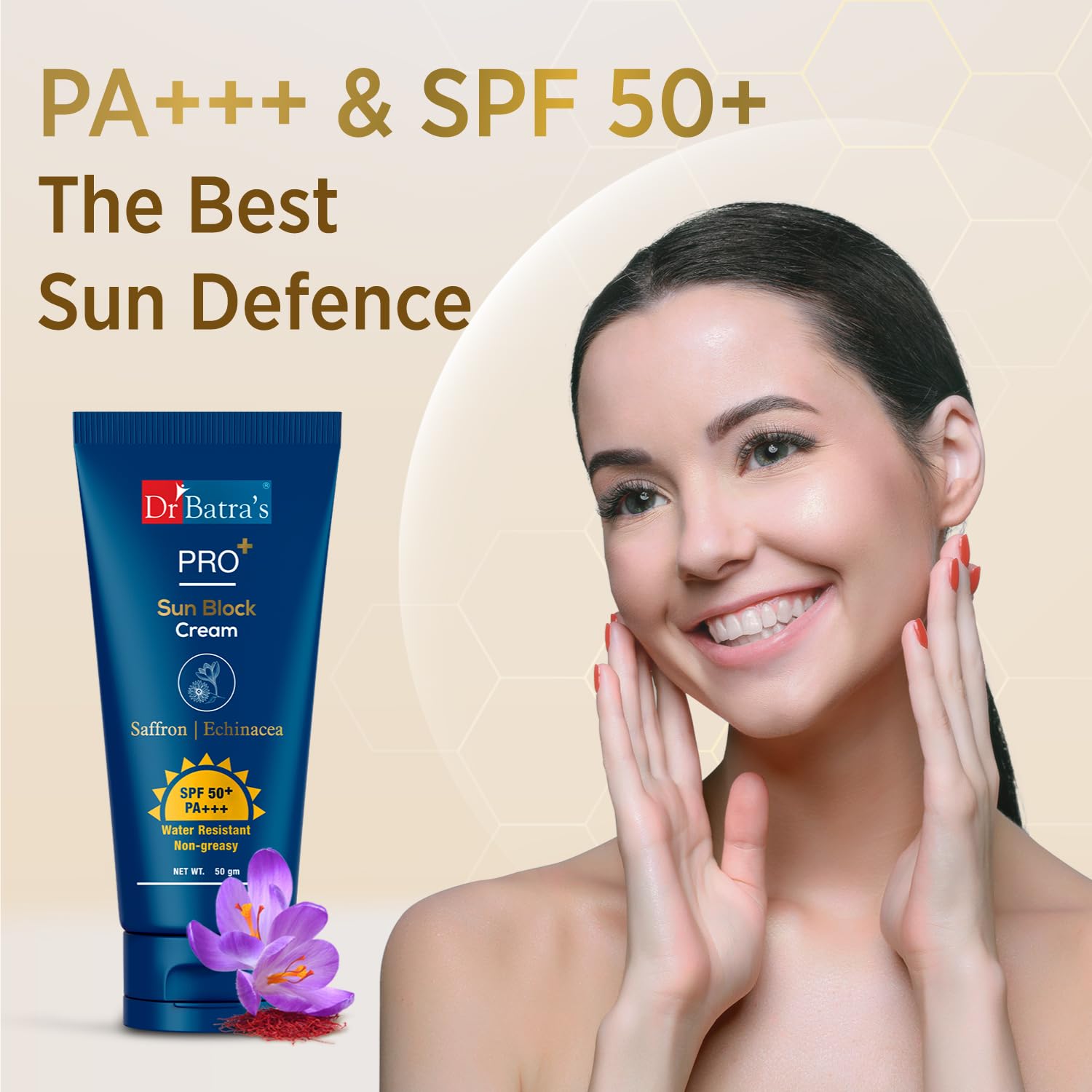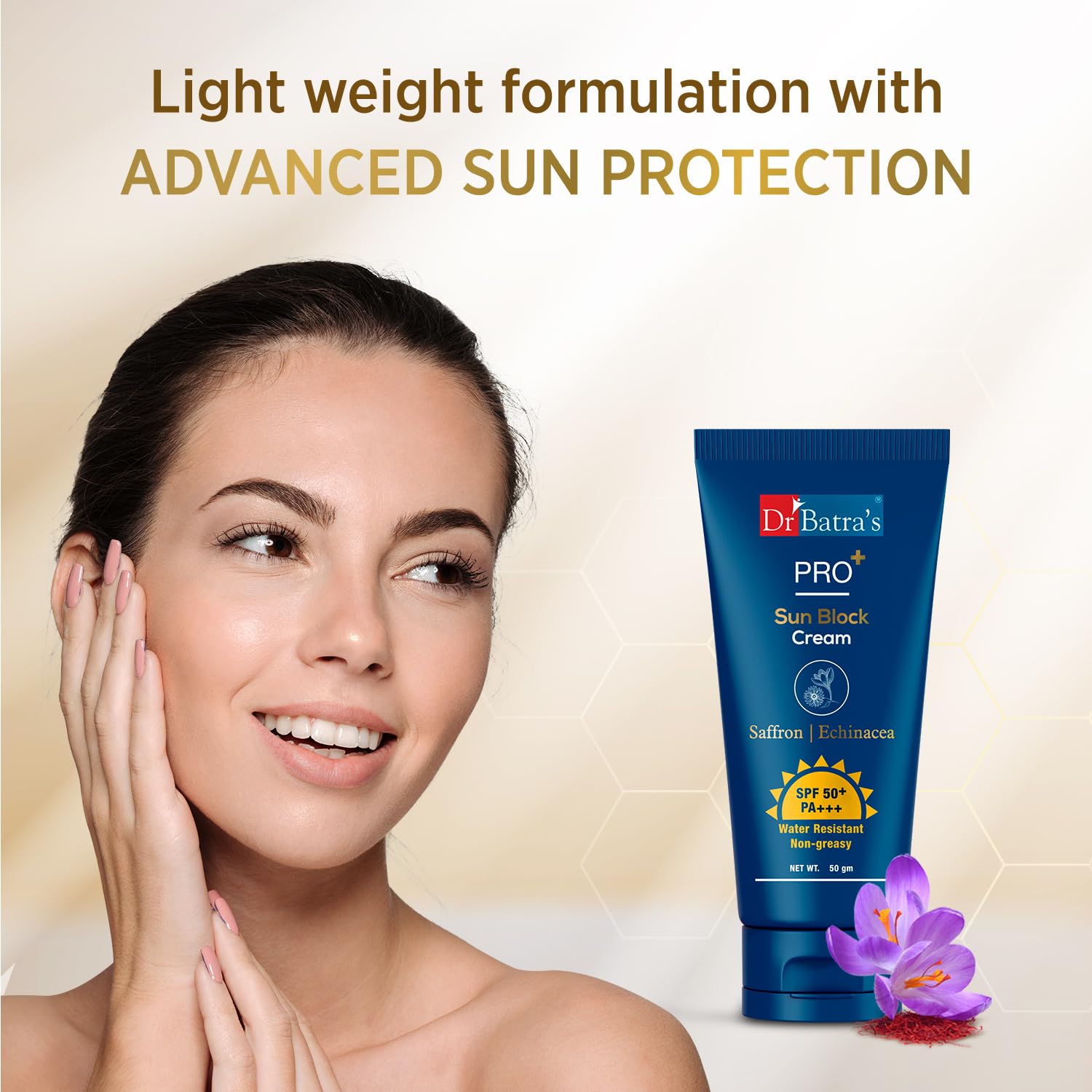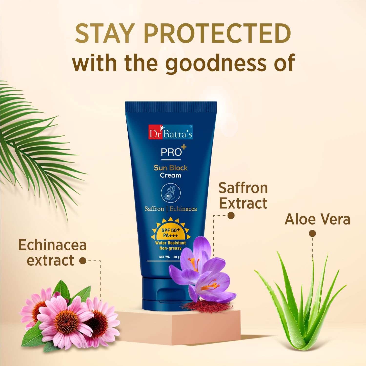 Dr Batra's range of skincare products is carefully formulated with natural ingredients to moisturize repair and protect the skin from harmful sun rays. Dr Batra's PRO+ Sun Block Cream contains protection properties and increases the moisture balance of the skin. Strengthened with extracts of Echinacea its powerful properties help to protect skin against environmental damage. Enriched with Saffron it brightens the skin and s dark spots. Aloe Vera hydrates fight sunburn and enhance overall skin health. Dr Batra's PRO+ Sun Block Cream acts as a protective layer against harsh UVA and UVB rays and is o gentle on all skin types. Dr Batra's PRO+ Sun Block Cream helps to keep skin soft and youthful-looking by reducing wrinkles and fine lines. Dr Batra's PRO+ Sun Block Cream is enriched with the goodness of Saffron Echinacea and Aloe Vera. It protects your skin and enhances your skin o Saffron extracts are rich in antibrighten skin and pigmentation and dark spots. o Echinacea extracts have natural properties to protect skin from environmental impurities. o Aloe Vera extracts are rich in anti-properties hydrate skin and fight sunburn.