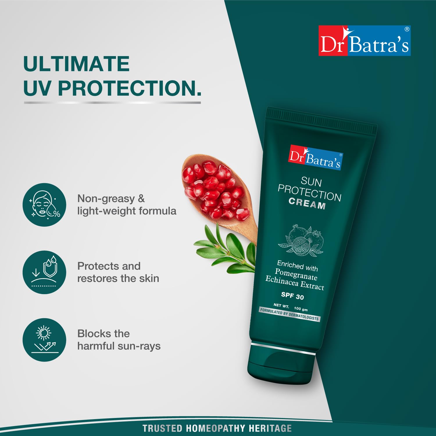 Dr Batra's range of skin care products are carefully formulated with natural ingredients to enhance and protect your skin. Dr Batra's Sun Protection Cream is a special non-greasy formula and is made with a blend of Echinacea and Pomegranate extracts. It gently protects your skin and at the same time provides enhancement. Suitable for all skin types this sun cream forms a protective layer from harsh UVA and UVB rays while the natural extracts help to keep your skin radiant. Free from harmful ingredients and mineral oil this is the best-suited sun cream for men and women.