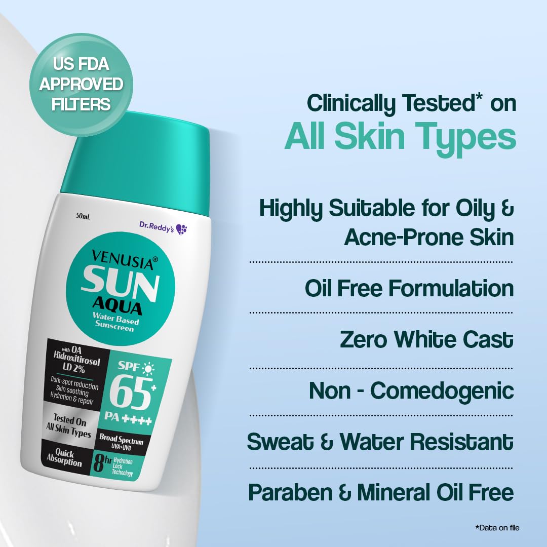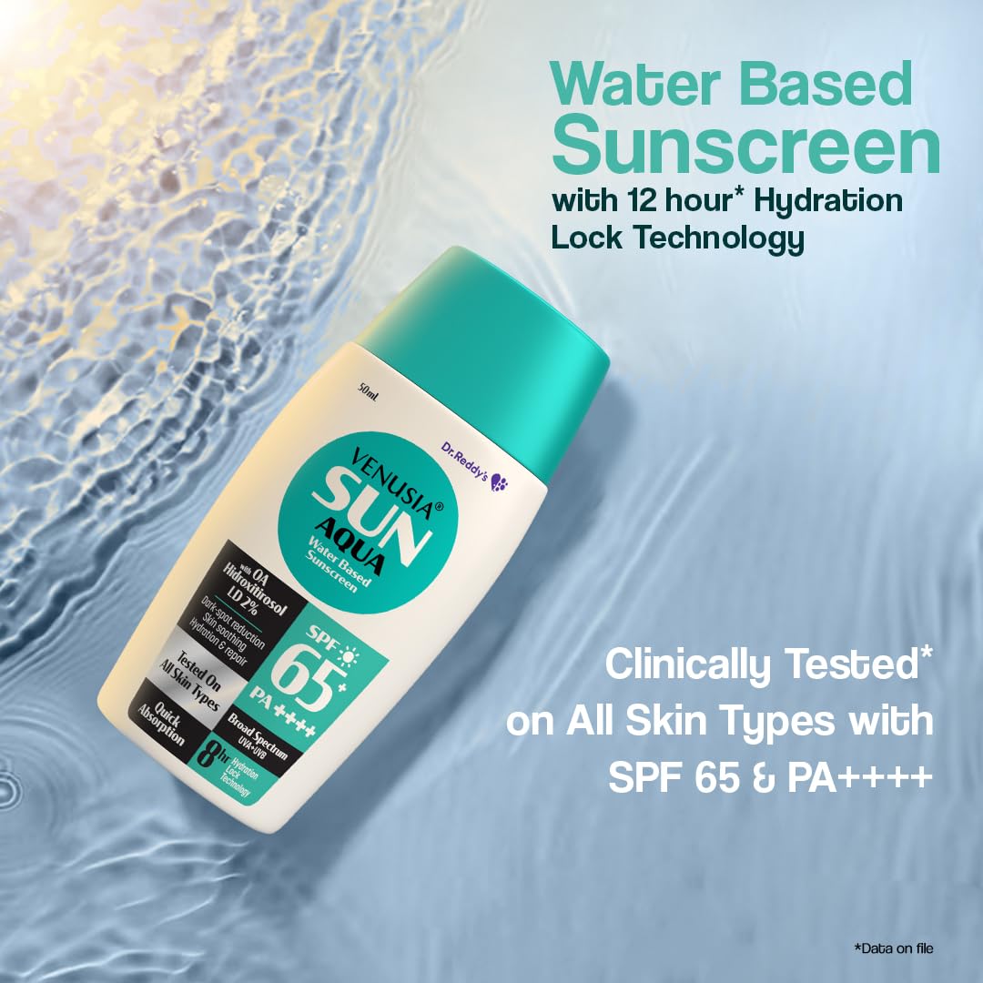 Venusia Water-Based Sunscreen with SPF 65 is the ultimate solution for complete sun protection and deep hydration. Its advanced broad-spectrum formula effectively defends against harmful UVA and UVB rays preventing & repairing sun damage. Infused with 2% OA Hidroxitirosol it provides 10X stronger UV protection than vitamin E and lightens pigmentation in just 8 weeks*. Designed for long-lasting hydration this lightweight Venusia Aqua's water-based sunscreen locks in moisture for up to 12 hours without feeling greasy or heavy. Its water-based ultra-light texture ensures zero white cast making it perfect for oily acne-prone and sensitive skin. This zero-white-cast sunscreen has sweat-proof and water-resistant properties to keep your skin protected and nourished all day long. *Data on file