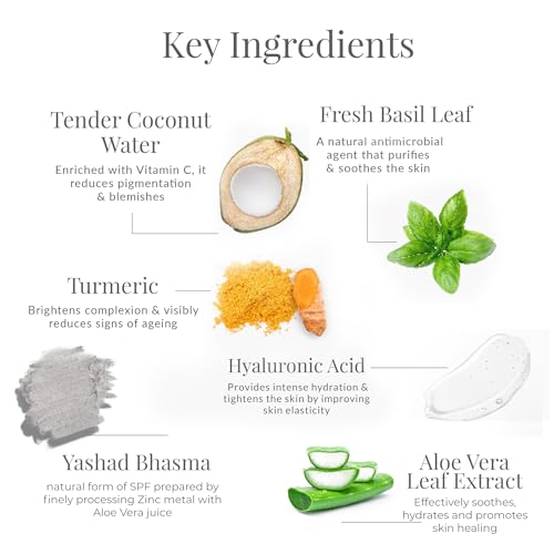 Design:Sun fluidMade with tender Coconut Water fresh Basil leaves and cooling Aloe Vera the Sun Fluid SPF 50| PA++ shields the skin from harmful UVA/UVB rays of the sun.Yashada Bhasma increases the intensity of sun protection thereby shielding the skin from early signs of aging and further enviromental damage.