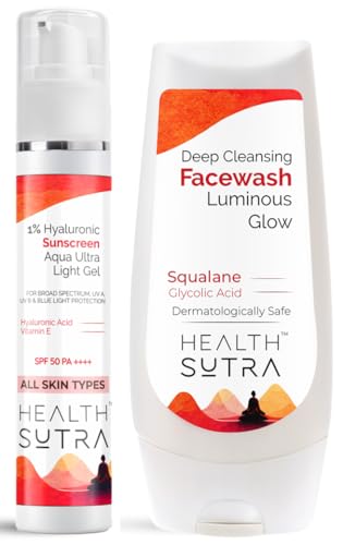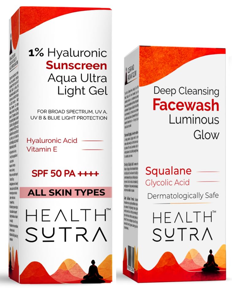Health Sutra 1% Hyaluronic Sunscreen Aqua Ultra Light Gel with SPF 50 PA++++ for Broad-Spectrum UV A UV B & Blue Light Protection for all Skin Types| Hydrating & Nourishing with Vitamin E |Lightweight Non-Greasy|Fragrance free PLUS Health Sutra Deep Cleansing Facewash Luminous Glow with Squalane & Glycolic Acid| Gel-Based Formula|Gentle Exfoliation|Soothing & Nourishing| Suitable for All Skin Types