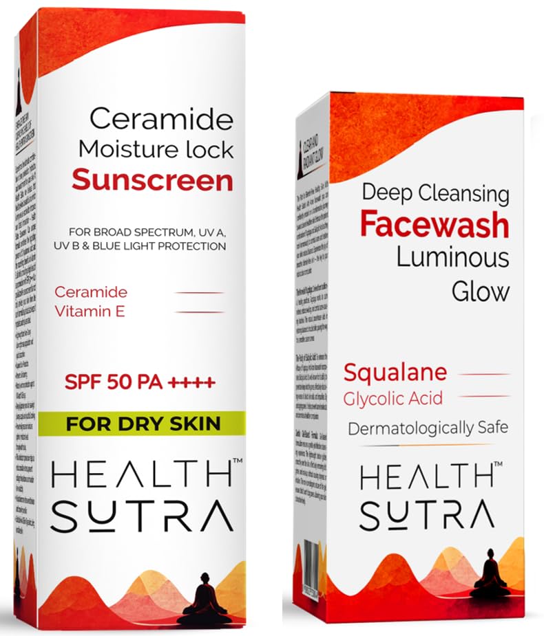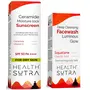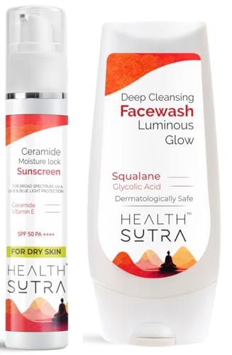 Health Sutra Ceramide Moisture-Lock Sunscreen |SPF 50 PA ++++ |Broad-Spectrum UVA/UVB Protection |Ceramide Vitamin E |Intensive Hydration |Lightweight Non-Greasy|Fragrance Free|Water-Resistant|Perfect for Dry Skin PLUS Health Sutra Deep Cleansing Facewash Luminous Glow with Squalane & Glycolic Acid| Gel-Based Formula|Gentle Exfoliation|Soothing & Nourishing| Suitable for All Skin Types