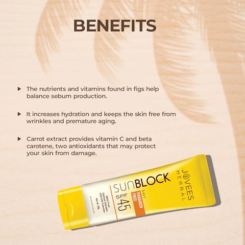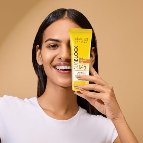 HomeHealth & PersonalSkin CareFace CareSunscreenJovees Herbal Sun Block SPF 45 For Even Toned & Glowing Skin | Suitable For Dry Skin | Sunscreen for UVA/UVB & Blue Light Protection | Lightweight & Non Grassy for Men & Women 100g