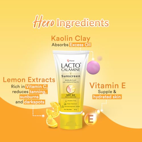 Lacto Calamine Sunscreen SPF 50 | 50g | PA +++ Sunscreen For Oily Skin | UVA – UVB Sunscreen | Water Resistant & No White Cast | With Kaolin Clay, Vitamin E & Lemon Extracts | Paraben Free