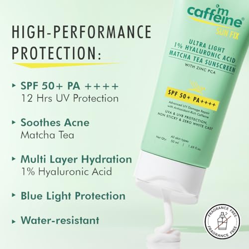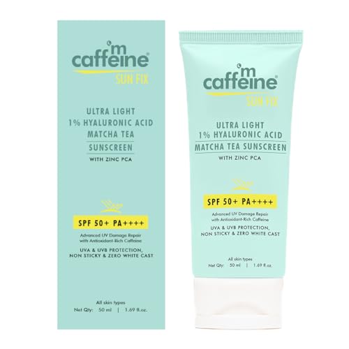 mcaffeine Sun Fix Ultra Light 1% Hyaluronic Acid Matcha Tea Sunscreen for All Skin Type Spf 50+ & Pa++++ Uva-Uvb & Blue Light Protection|No White Cast|Controls Oil|Non-Sticky|Fragrance Free - 50Ml