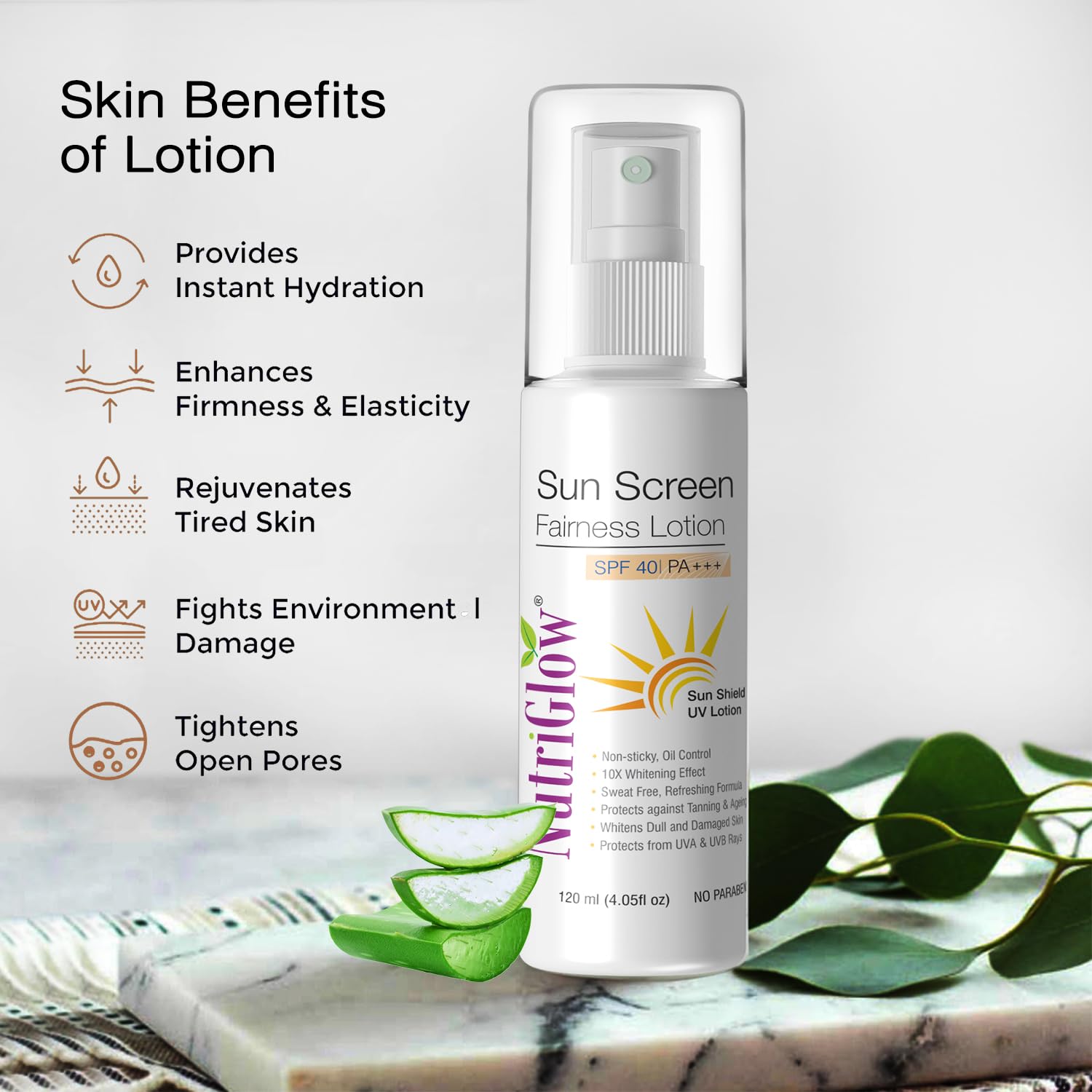 • Do you want to get rid of harsh tan that's just refusing to go away? NutriGlow Sun Screen Fairness Lotion eliminates that tan and cares for your sunburnt skin effortlessly. On the other hand it helps exfoliate dead skin cells unclog the pores cleanse dirt