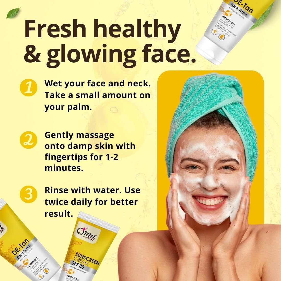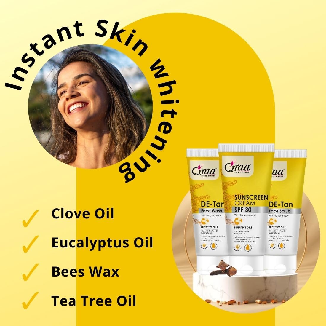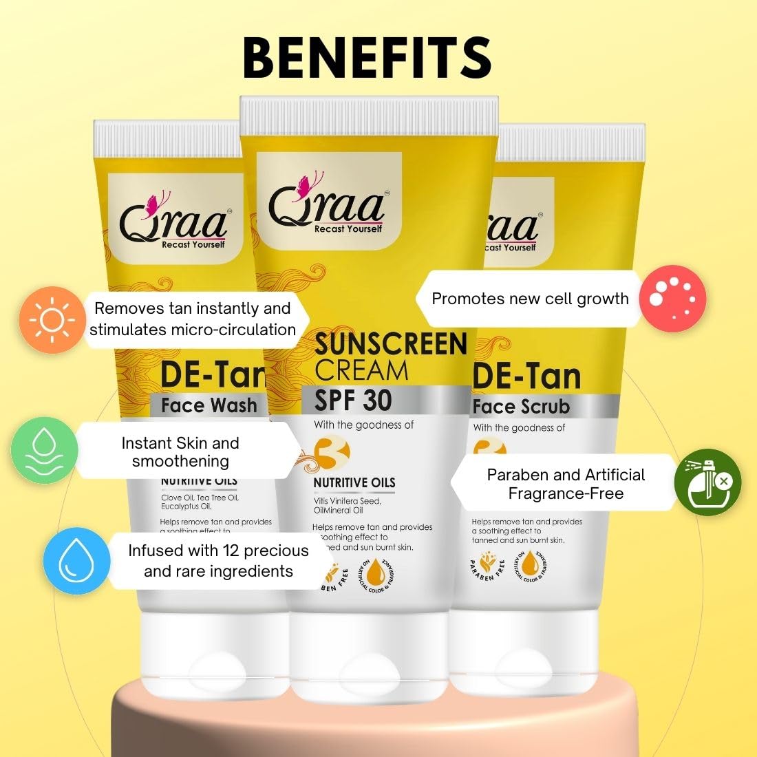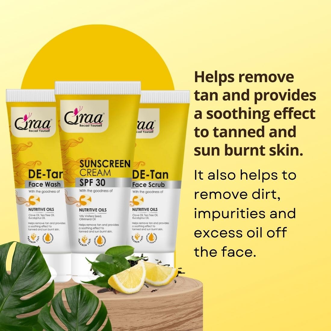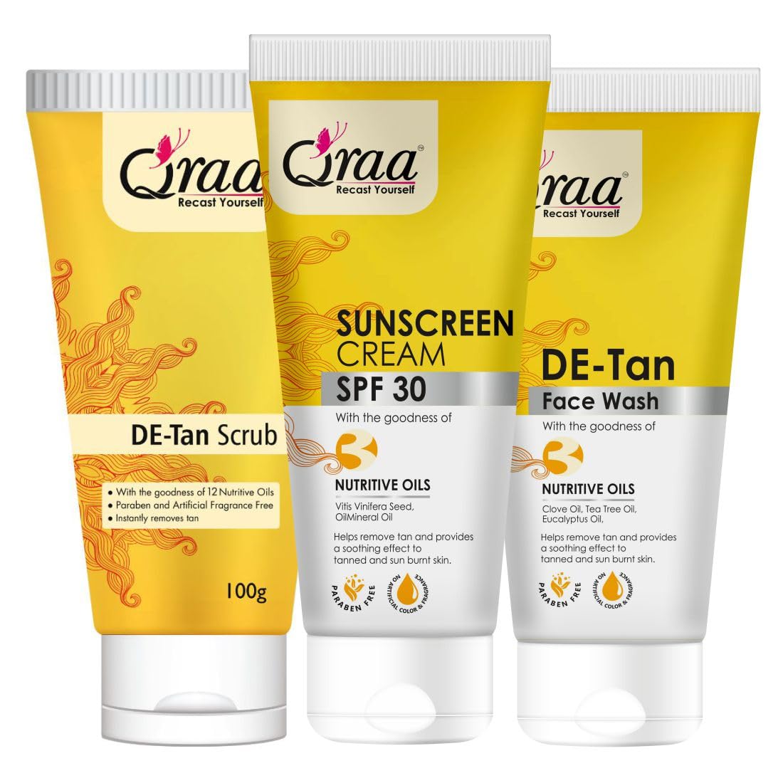 • Qraa Men De Tan Combo Pack For Men’s - comes with multipurpose benefits for the tough skin of the males This brilliant product not only helps do away with sun damage but in addition comes with added lightening and skin brightening benefits.