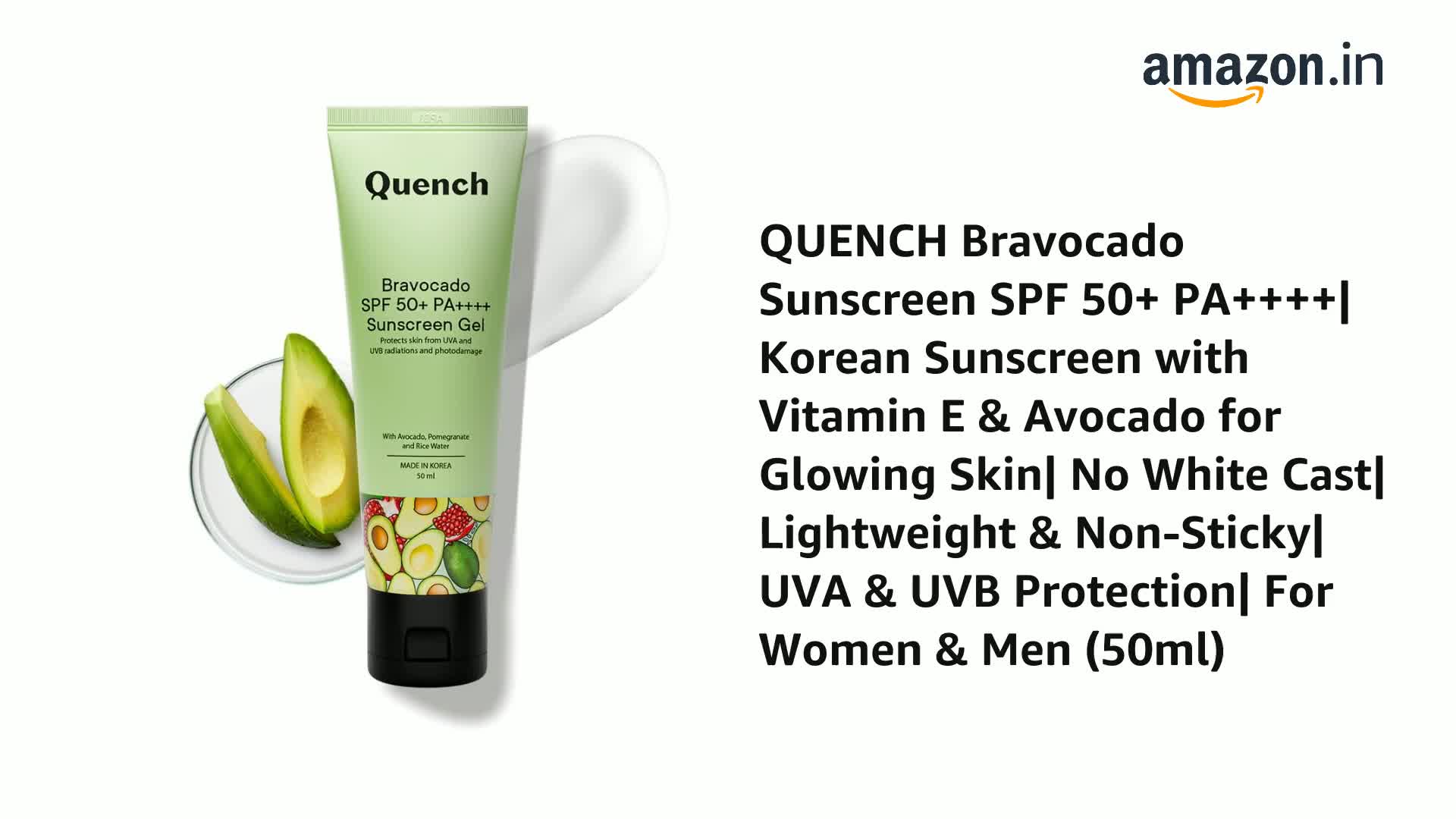 HomeHealth & PersonalSkin CareFace CareSunscreenQUENCH BOTANICS Bravocado Sunscreen Spf 50+ Pa++++ Korean Sunscreen With Vitamin E & Avocado,No White Cast Lightweight & Non-Sticky, Uva & Uvb Protection For Women & Men (50Ml) All Skin Type