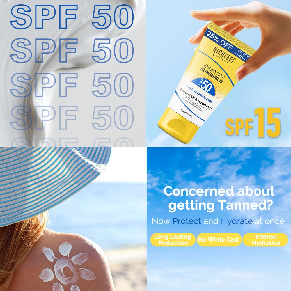 Protect your skin from harmful UV rays with RichFeel Naturals Everyday SunShield SPF 50. This lightweight non-greasy sunscreen provides broad-spectrum UVA & UVB protection keeping your skin safe from sun damage tanning and premature aging. Infused with natural ingredients it hydrates and nourishes while offering long-lasting sun defense.