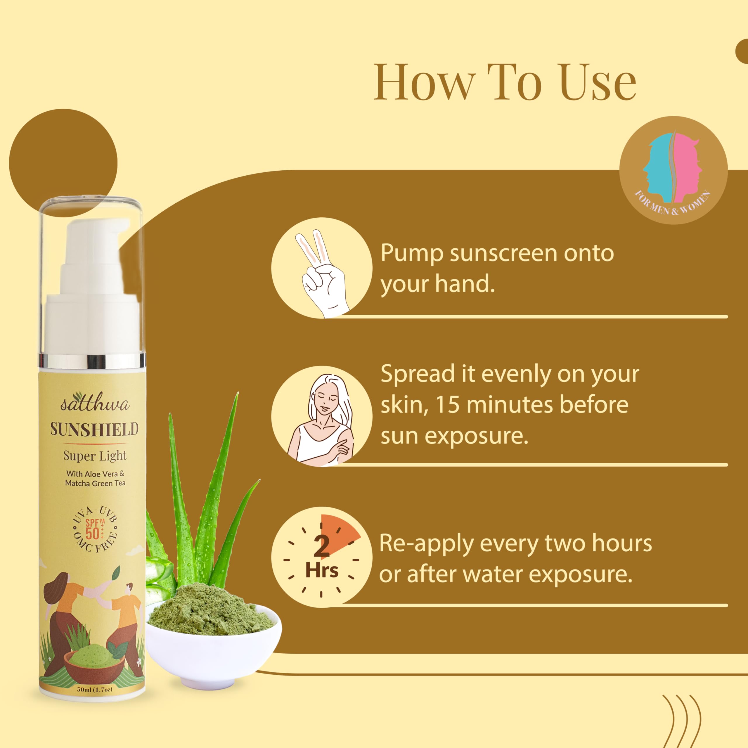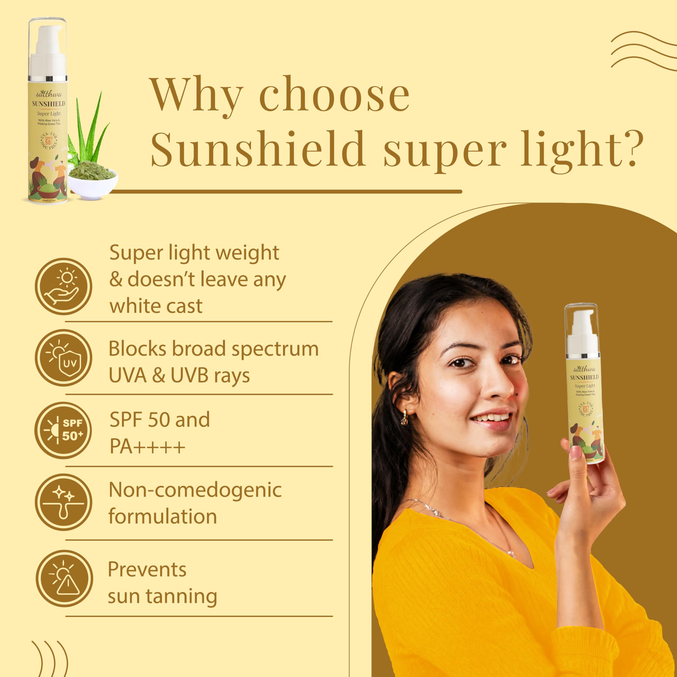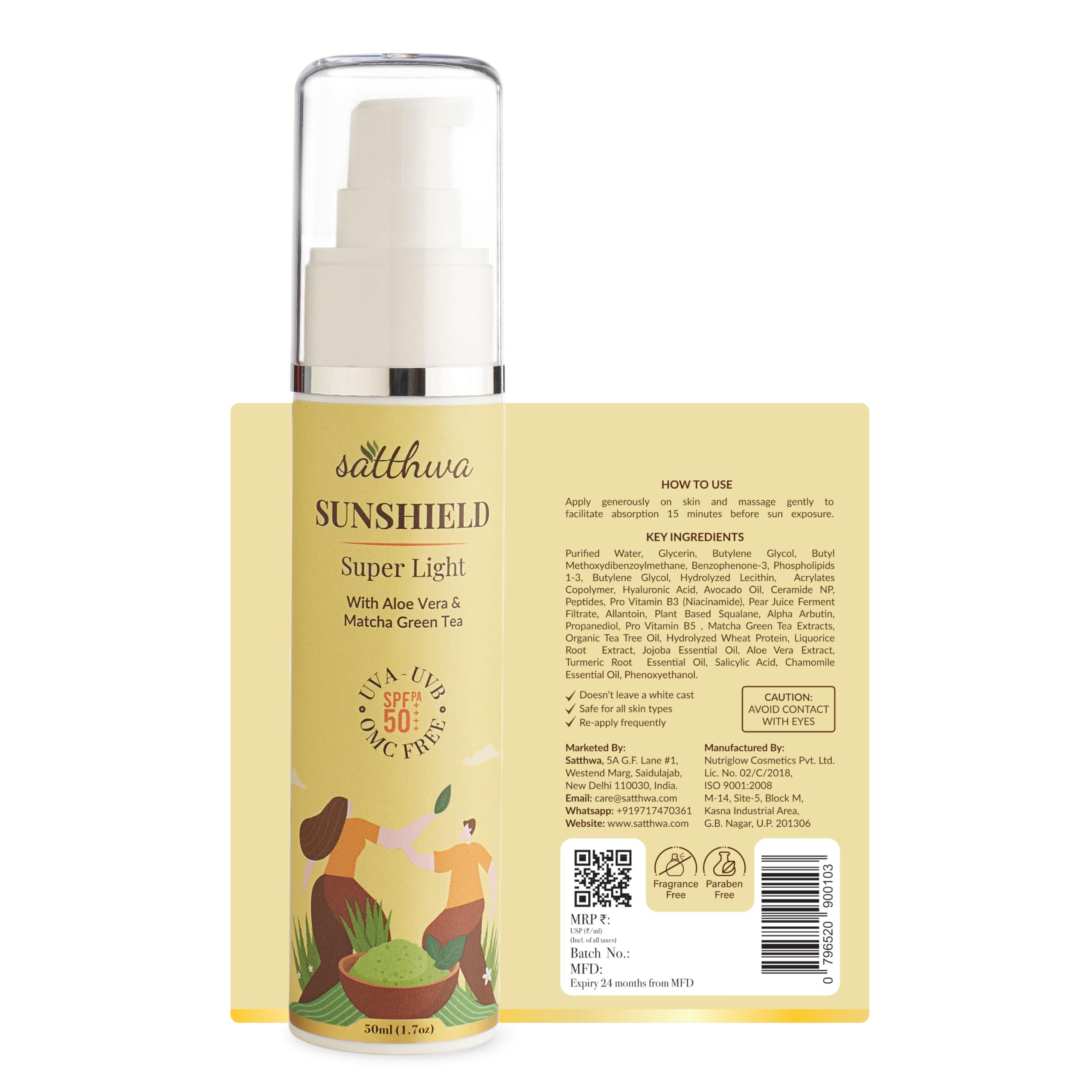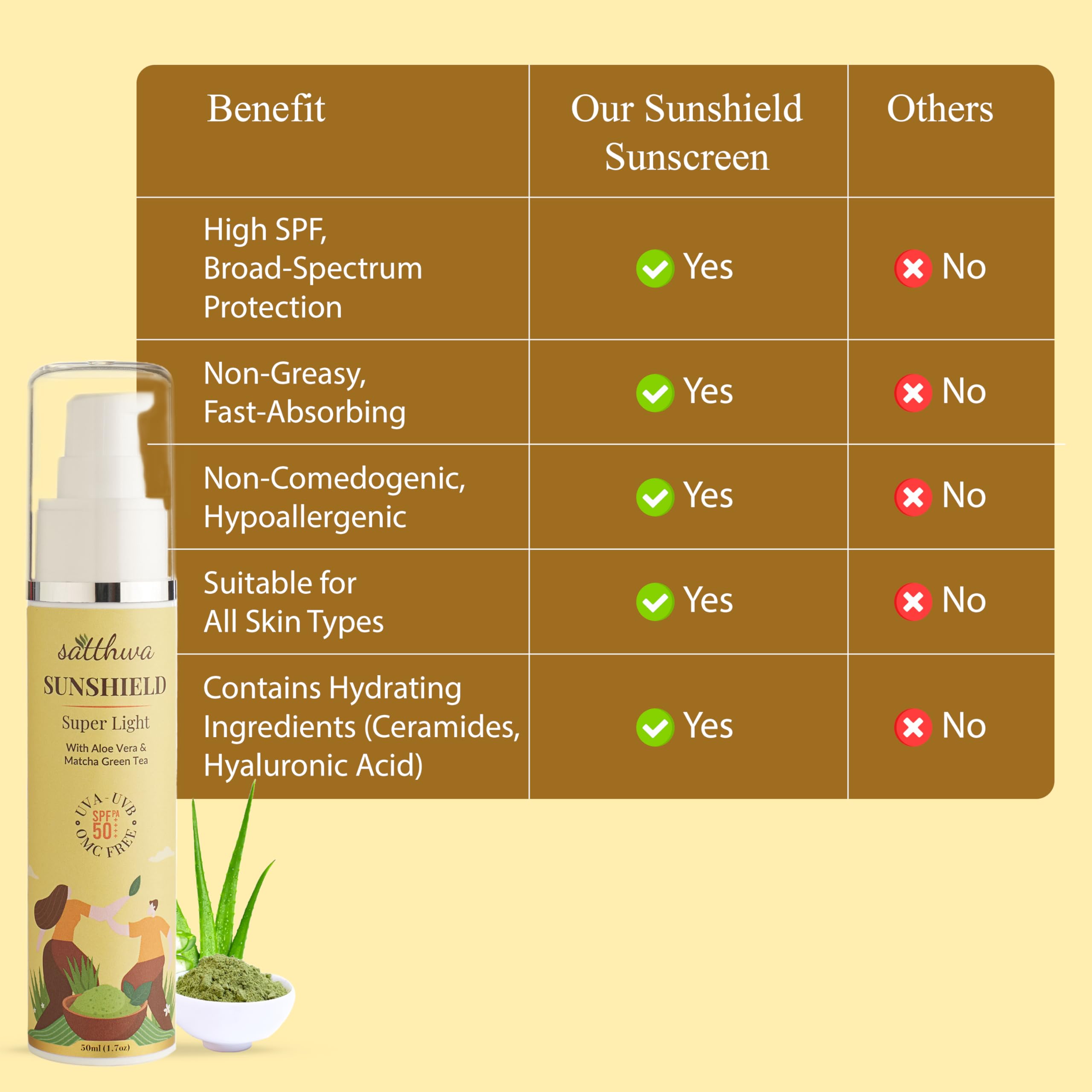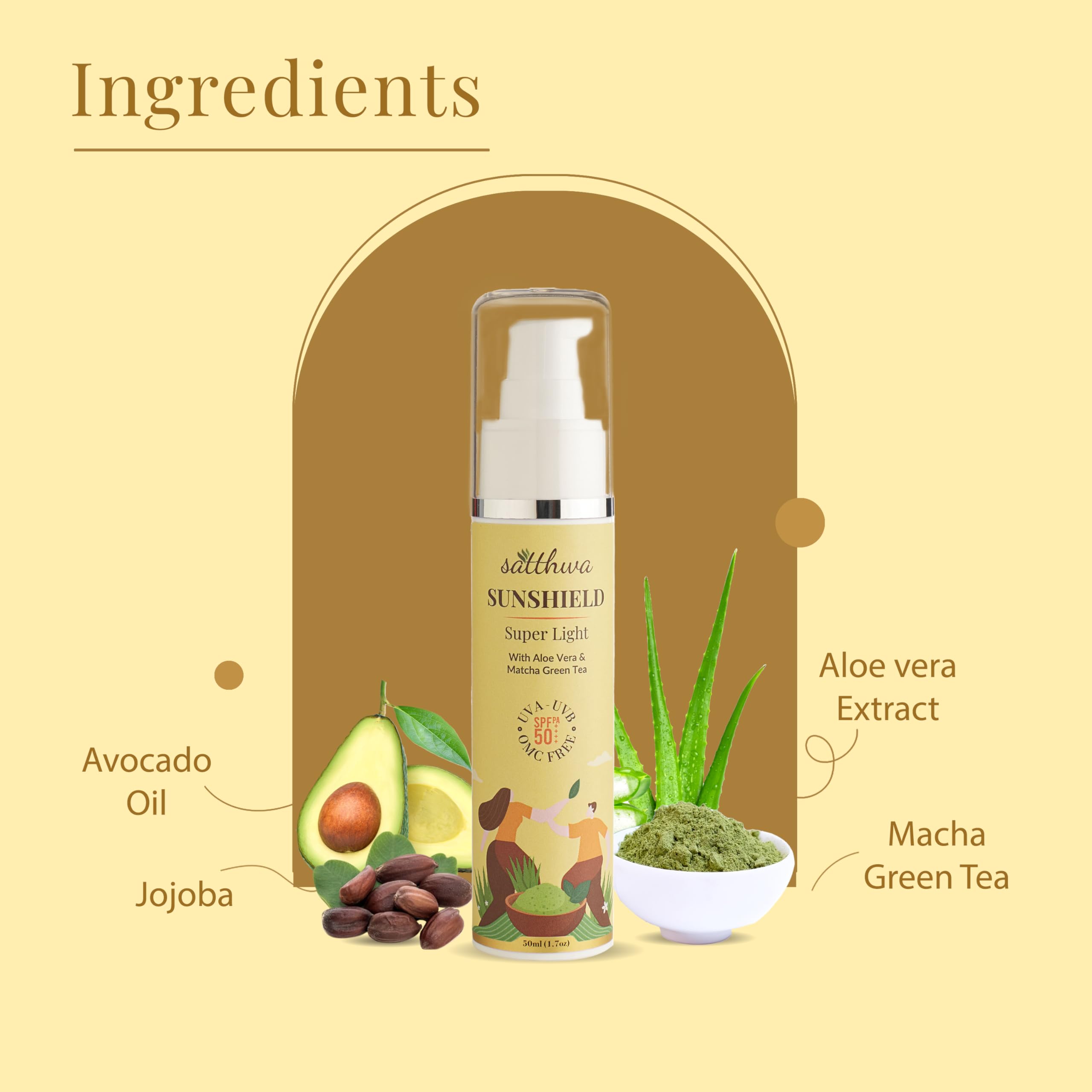 Satthwa Sunshield Super Light Sunscreen with Aloe Vera & Matcha Green Tea - Hyaluronic SPF50 PA++++ 50ml