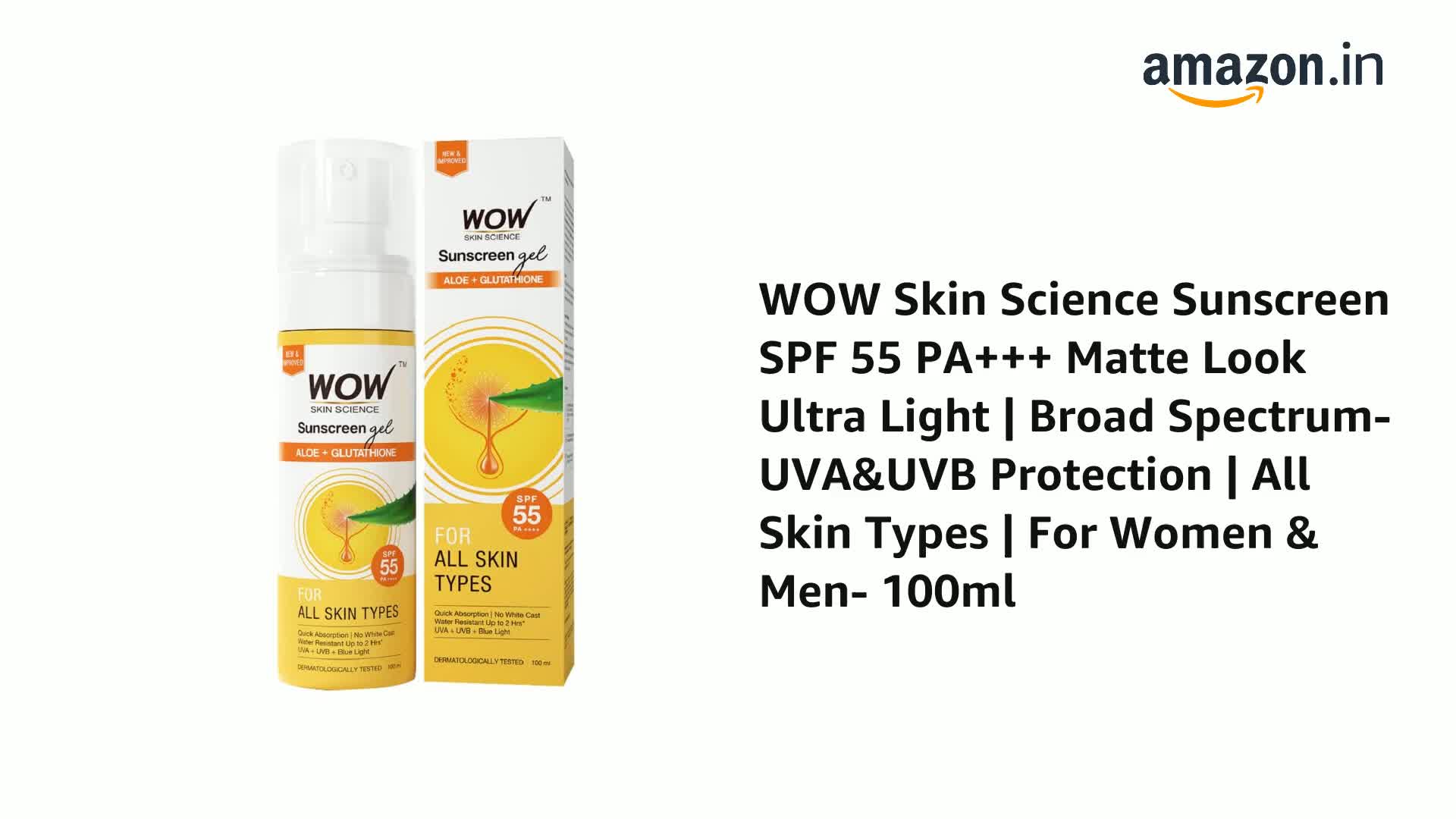 Shield your skin from the UV radiation damage and environmental pollutants with WOW Skin Science sunscreen SPF 55. It provides broad-spectrum protection from harmful UVA & UVB rays and photo damage. Infused with the goodness of raspberry extract avocado oil carrot seed extract and vitamin e. The active ingredients rich in vitamins a c and e prevent skin damage by neutralizing the free radicals and UV rays. It helps to protect skin from UV radiation inhibit signs of aging neutralize photo damage soothe redness and prevent dryness due to sun exposure. Protects skin from dehydration and diminishes wrinkles and brown spots. This sunscreen helps to protect your skin not just from sun-damage but also keeps it safe from harmful chemicals as it is without any benzophenone and oxide colour It is a lightweight formulation that is non-greasy and you donât have to worry about whitish chalky skin because it has a non-streaky and non-chalky texture that does not weigh down your skin. It spreads evenly and dries quickly without clogging your pores to form a transparent film that shields your skin. It is infused with high concentration of skin-nourishing natural actives. Raspberry extract is rich in vitamin c with natural sun blockers that prevent and repair skin damage caused by sun. Carrot seed extract has vitamins a and e that help to keep photo damage in cheek and diminish signs of aging. Avocado oil has mono-unsaturated fats that deliver natural sunscreen benefits and protects skin from getting tanned. Vitamin e is a powerful antioxidant that neutralizes free radicals and helps to repair damaged skin. Formulation : Spray