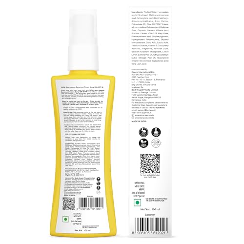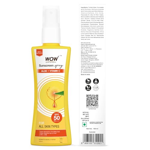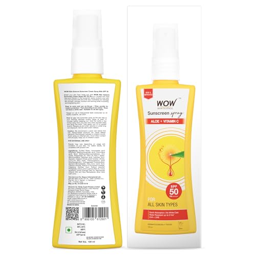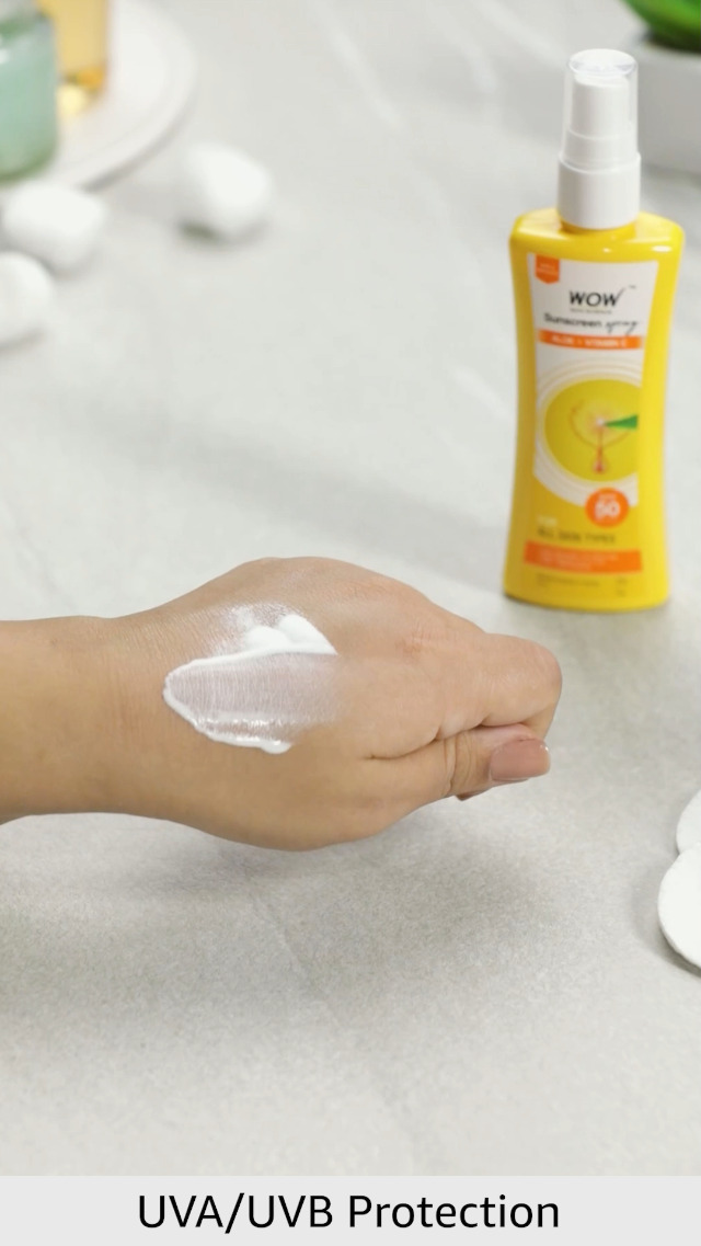 Give your skin balanced care and keep it protected from the sun's harsh rays for an extended time with WOW Sunscreen Spray With SPF 50 PA++++ For All Skin Types. It gives your skin an effective broad-spectrum protection against the sun's harmful UVA & UVB rays. The sunscreen is infused with sun blocker aloe vera and active ingredient vitamin C which is a potent antioxidant. This broad-spectrum sunscreen spray has a lightweight liquid formula with a smooth texture that gets seamlessly absorbed into the skin. It leaves a protective film on the skin that helps to reflect and block the skin-damaging UVA and UVB rays. The aloe vera in the sunscreen not only blocks the UV rays but also helps to reduce redness and soothe sunburn. It also protects skin from excessive dryness and skin-dehydration caused by sun exposure. Key active vitamin C protects skin from oxidative damage and prevents excessive melanin production in the skin. This helps to minimize dark spots pigmentation and brightens dull complexion. It is suitable for all skin types.