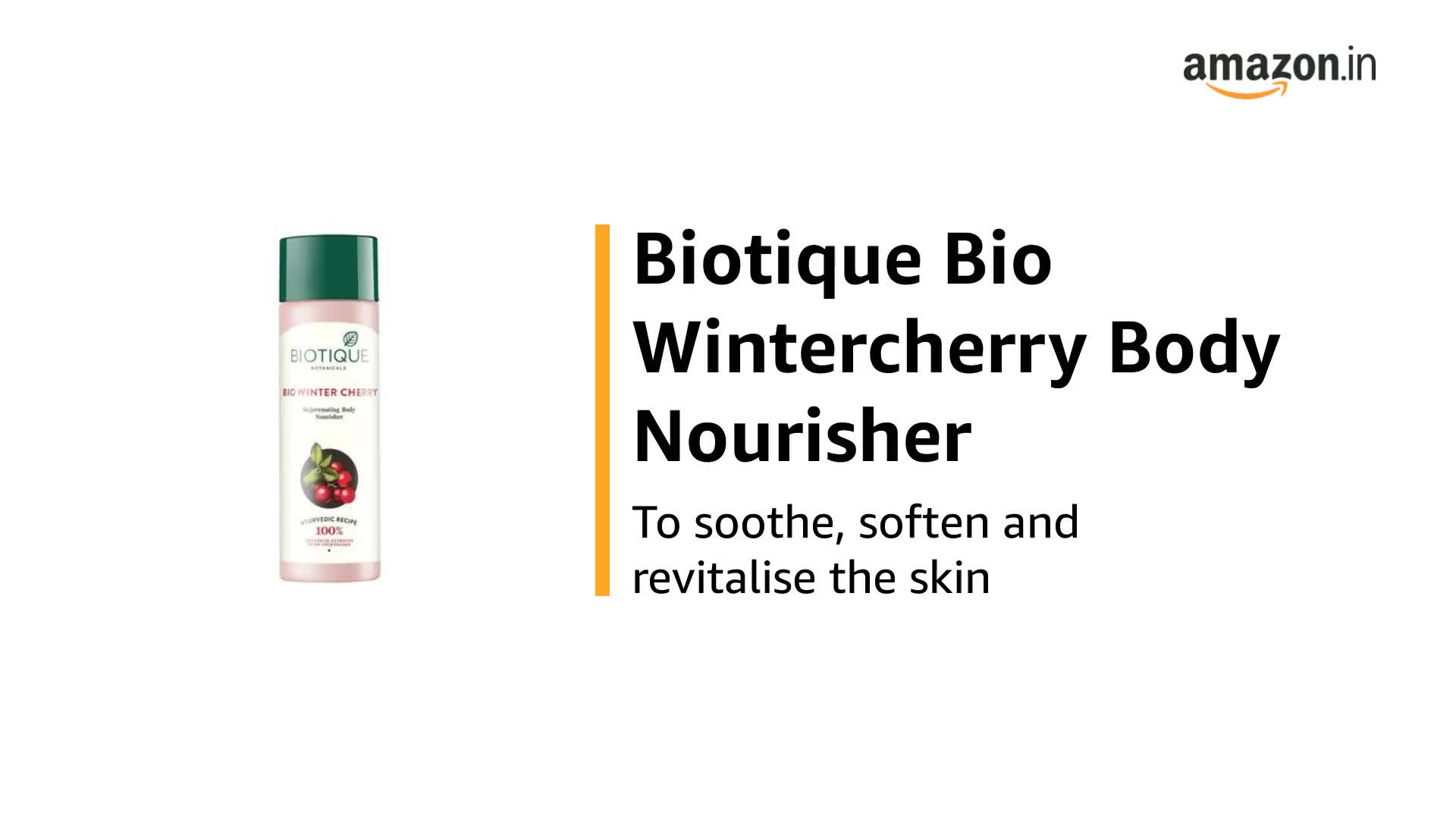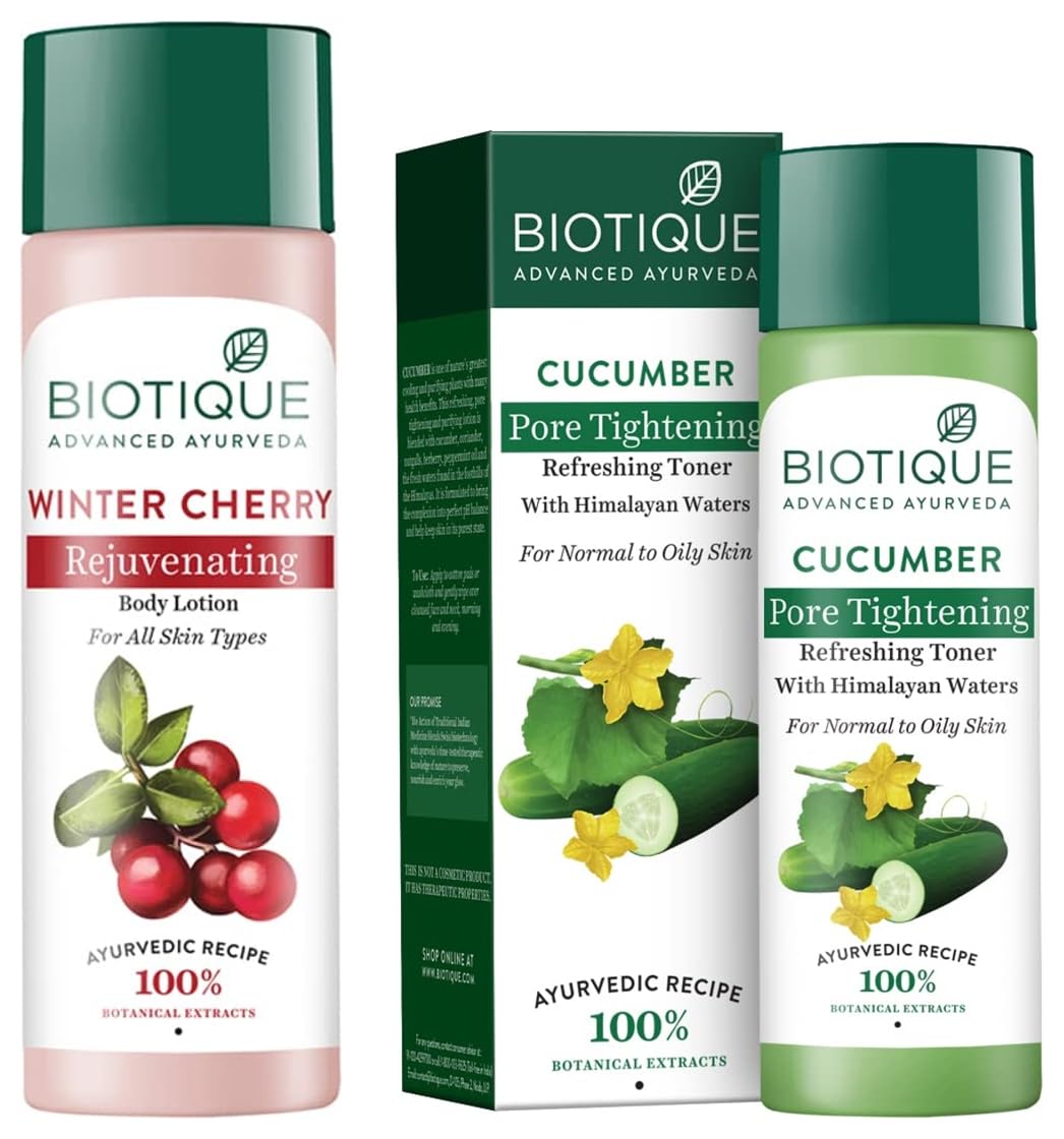 Biotique Bio Cucumber Pore Tightening Toner 120mlMake way for radiant skin with Biotique Bio Cucumber Pore Tightening Face Freshener. This Unisex formula can work on all skin types.This Biotique Face Freshener is a blend of natural ingredients like Cucumber Coriander Nutgalls Berberry Peppermint Oil and Pudina which combine to serve as effective toners and reduce the size of your pores. This solution purifies your skin by getting rid of microbes and other pollutants. This Cucumber Face Freshener tightens your pores and makes your skin healthier from within. This freshener does not contain alcohol and is safe to use on sensitive skin. The Biotique solution leaves your skin refreshed and smooth. This pore tightener also restores the pH balance of your skin. Now achieving glowing skin naturally is made simple with Biotique Cucumber Face freshener.Biotique Bio Wintercherry Lightening And Rejuvenating Body Nourisher 190mlA light nourishing lotion made of natural oils and plant extracts. It nourishes the skin leaving it soft and youthful. Helps remove skin infection and blemishes.With the Wintercherry Lotion your skin recovers its suppleness and softness. Soothes softens and revitalizes even weather-roughened body skin as it promotes elasticity suppleness and moisture balance.