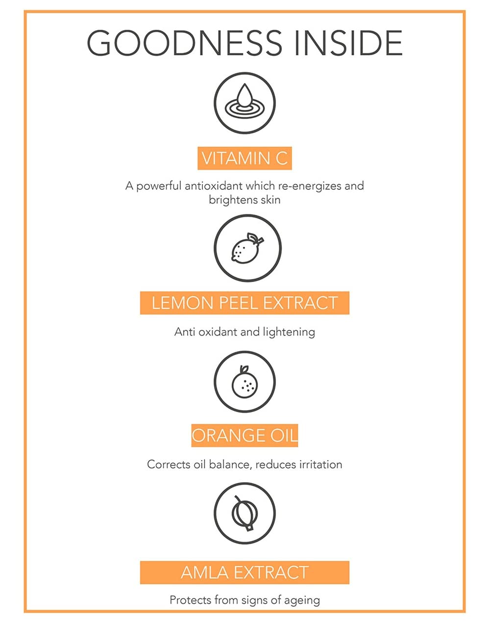 • Orange extract is a gentle astringent that corrects oil balance s irritation acne and prevents scars