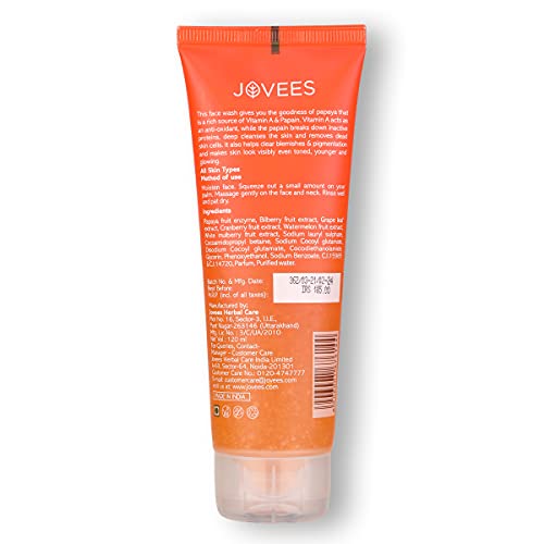 • Jovees papaya facewash contains papaya fruit enzymes that help reduce dark spots pigmentation acne scars and fine lines. Its natural and effective exfoliating properties brighten the skin by removing dead skin cells and flaky patches on the top layer of y