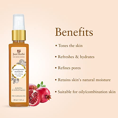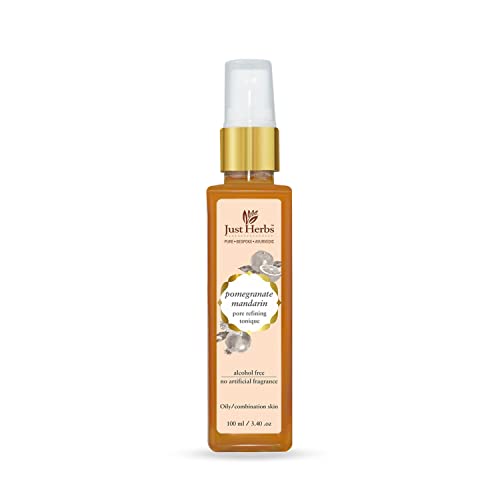 The alcohol-free formula of this facial toner is ideal for oily/combination skin types with visible pores. A nourishing blend of the steam distilled waters of mandarin traditionally used in Ayurveda for a variety of skin benefits and Pomegranate extract a natural astringent that helps loosen and minimize the appearance of skin pores. Orange peel and bitter orange essential oil impart anti-microbial properties to this product and help acne-prone skin guard against infections from pollutants dust and grime. Just Herbs toners are free from alcohol making them gentle to use without stripping the skin off its natural oils.