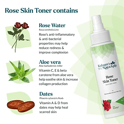 • Achieve even skin tone and fresh face with Kulsum's Kaya Kalp Herbals Rose Skin Toner formulated with natural skin-boosting ingredients rose water aloe vera and dates.