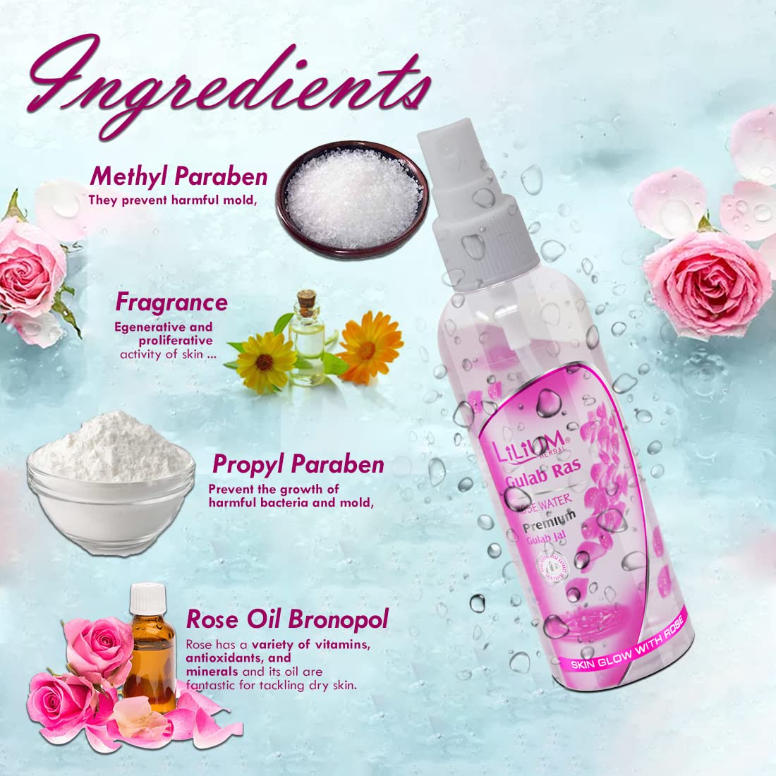 • [CONTAINS ANTI-OXIDANTS] Rose petals and rose oil contain a number of powerful antioxidants which can help protect cells from damage; Lilium Rose Water originally made from rose petals.