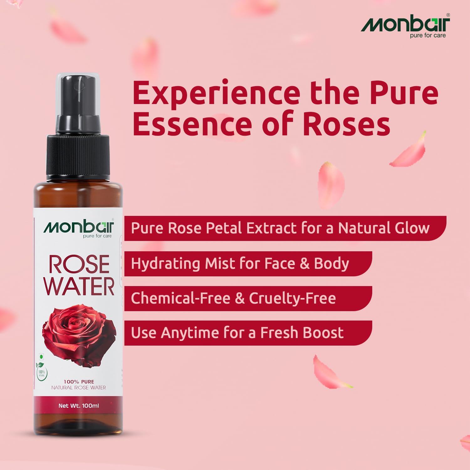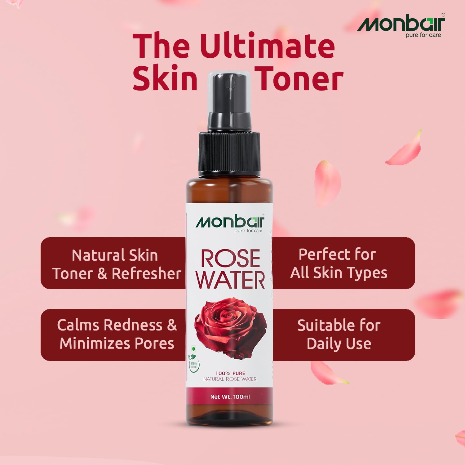 Experience the pure essence of roses with Monbair Rose Water. Sourced from natural rose petals this gentle and versatile beauty essential offers hydration toning and revitalization for all skin types. Ideal for skincare routines this rose water soothes refreshes and adds a natural glow to your skin. Key Benefits: Hydrates & Tones: Provides gentle hydration improving skin tone and texture. Soothes Skin: Reduces redness and refreshes skin for a naturally healthy glow. Natural Ingredients: Made from pure rose petals without any artificial fragrances or preservatives. Versatile Use: Can be used as a facial toner makeup setting spray or a base for DIY skincare. How to Use: As a Toner: Apply a few sprays directly to your face after cleansing or use a cotton pad. As a Refreshing Mist: Spray throughout the day for an instant boost of hydration. In DIY Face Masks: Mix with powders like turmeric or sandalwood for a calming rejuvenating face mask.
