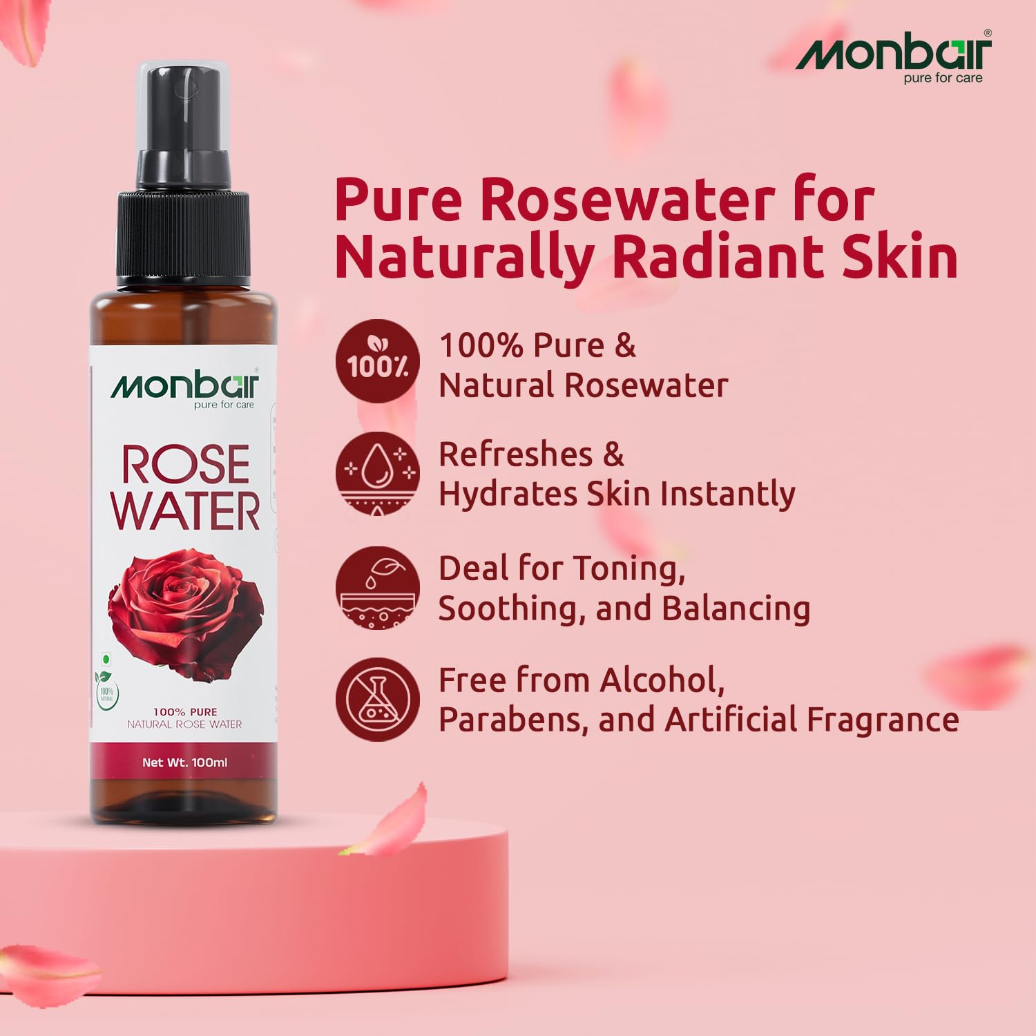 Elevate your skincare routine with the Monbair Pure Distilled Rose Water Combo Pack (2 x 100ml). Crafted from premium rose petals this 100% natural rose water is designed to cleanse tone and hydrate your skin leaving it radiant and refreshed. This combo pack offers double the benefits making it perfect for daily use or sharing with loved ones. The Monbair Rose Water is a versatile skincare essential functioning as a natural toner hydrating facial mist makeup setting spray and a key ingredient in DIY face packs. Its gentle and soothing formula helps balance your skinâs pH reduce redness and revitalize your complexion. â Key Features: Monbair Combo Pack: Includes 2 bottles of 100ml each for extended use. Made with pure distilled rose petals for maximum natural benefits. Perfect as a toner hydrating mist and pore cleanser. Suitable for all skin types including sensitive skin. Free from parabens sulfates and artificial fragrances. â How to Use: Toner: Apply directly to your face after cleansing for a refreshed feel. Hydrating Mist: Use throughout the day to moisturize and rejuvenate your skin. DIY Face Packs: Mix with Multani Mitti Wild Turmeric Powder or other ingredients for glowing results. â Why Choose Monbair Rose Water Combo? This combo ensures you always have the gentle touch of Monbair Pure Distilled Rose Water at home and on the go. Its multipurpose benefits make it a must-have addition to your skincare essentials. Add the natural goodness of Monbair Pure Distilled Rose Water to your skincare routine and enjoy a refreshed glowing complexion every day!