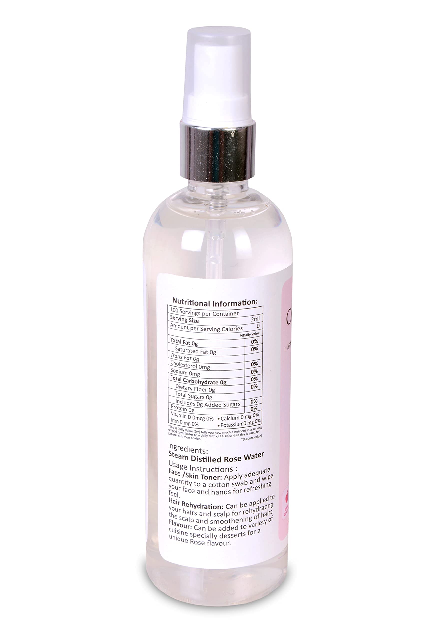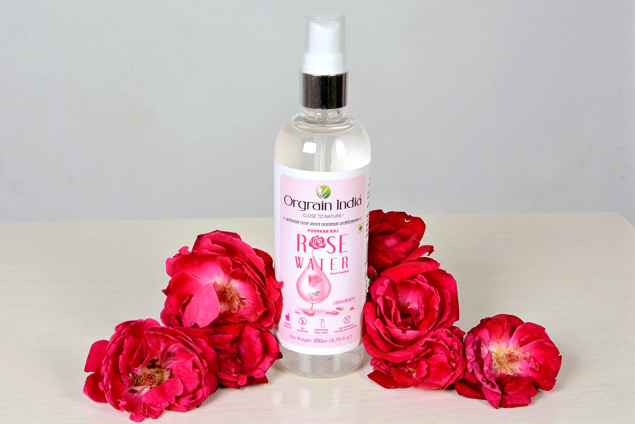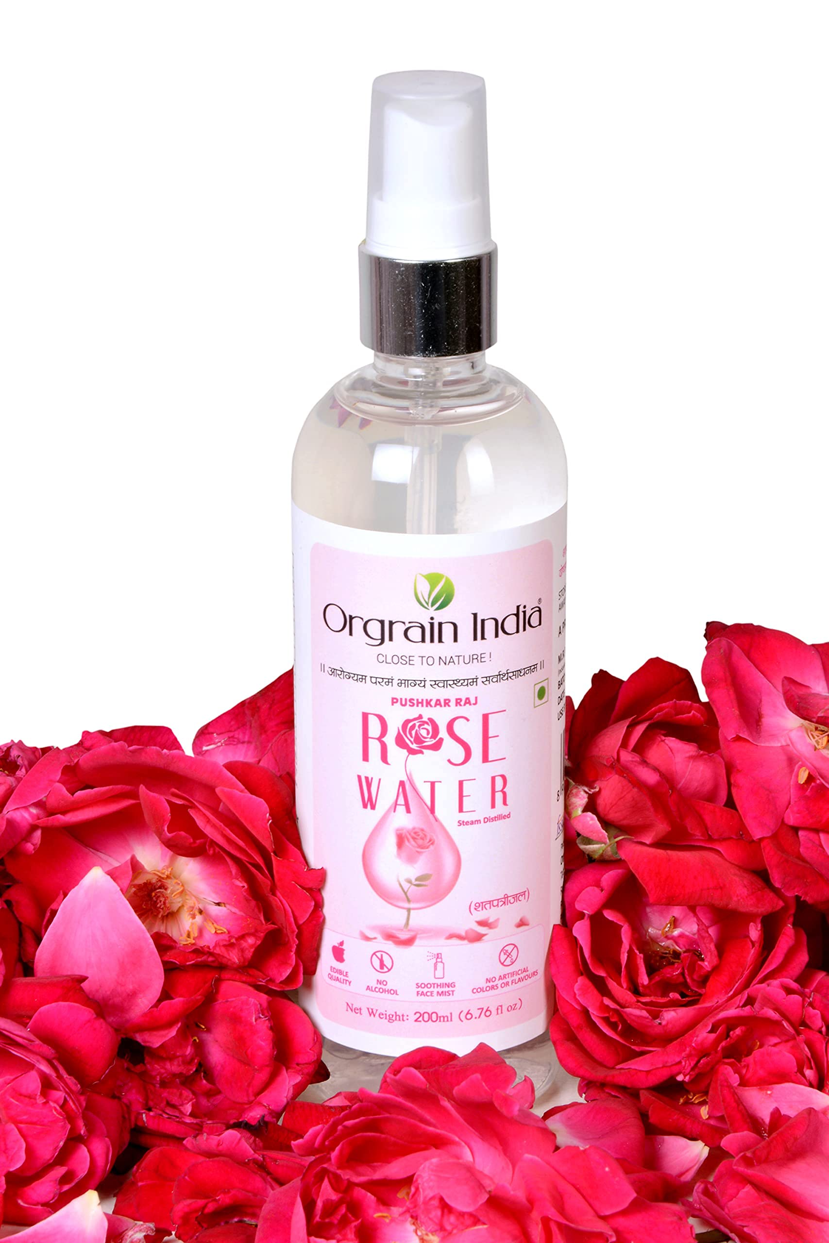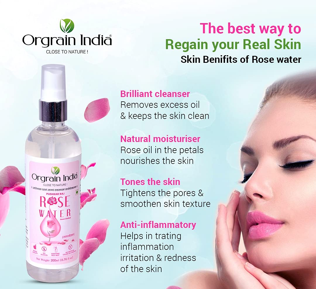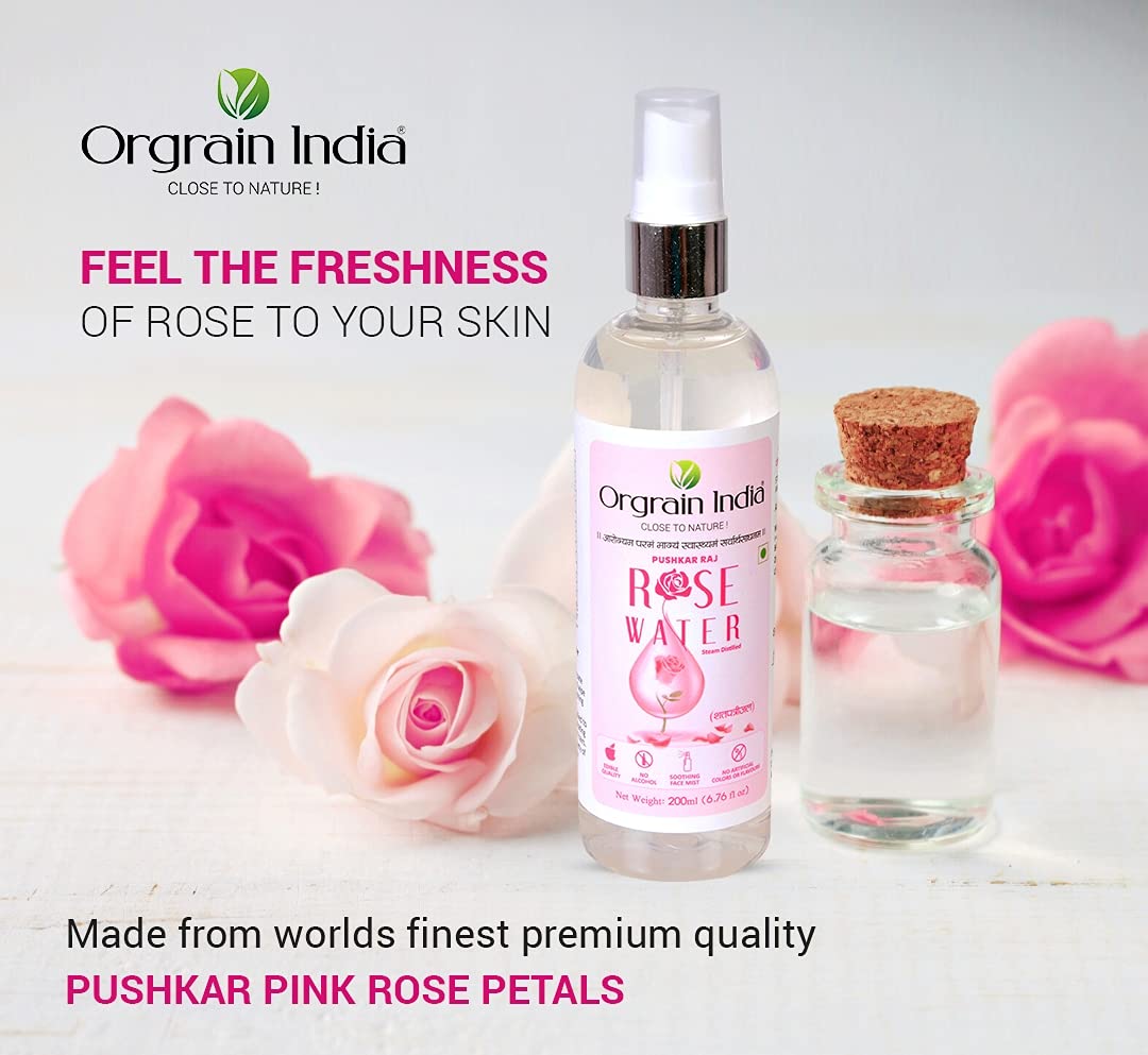 Orgrain India Pushkar Freshpink Rose water is free from any added artificial colour and flavor. It is made from only rose petal extracts and DM water. Orgrain India Pushkar Freshpink Rose water is applicable as well as edible. Due to its soothing and anti-inflammatory properties rose water can be used to relieve sore throat.