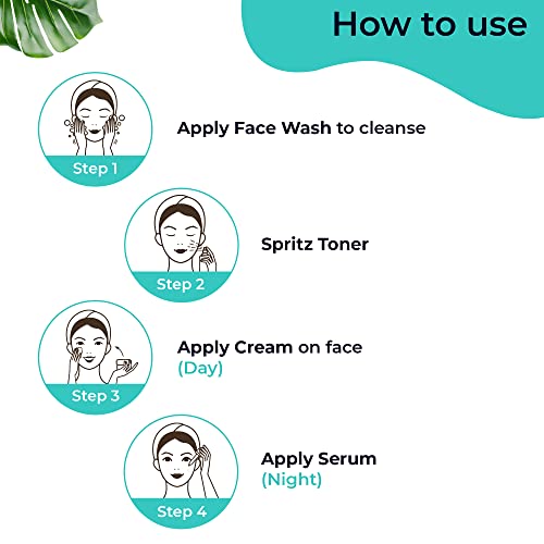 • HOW TO USE: Apply face wash to cleanse your face. Gently spritz toner and apply the cream In AM and serum in PM.