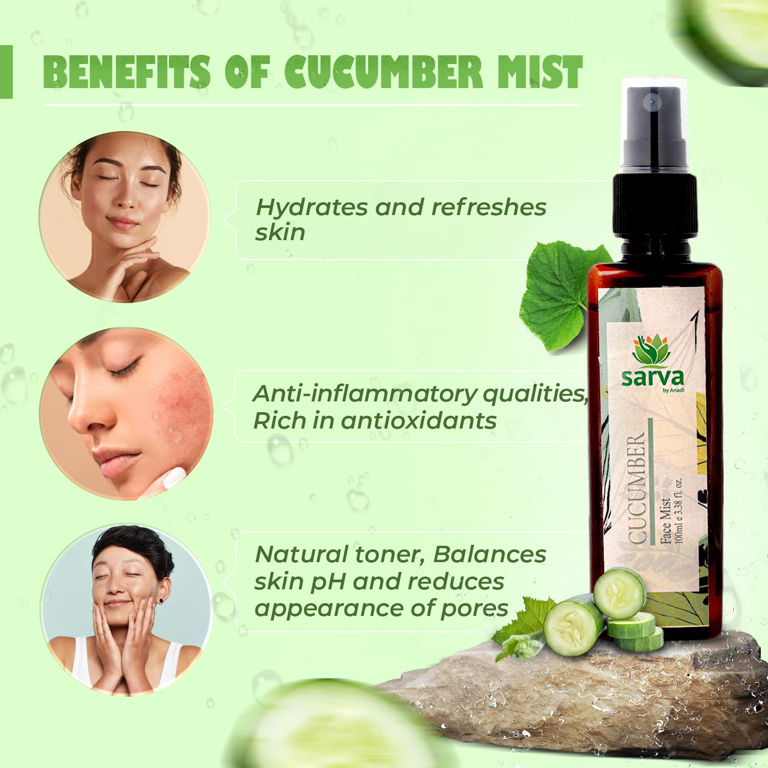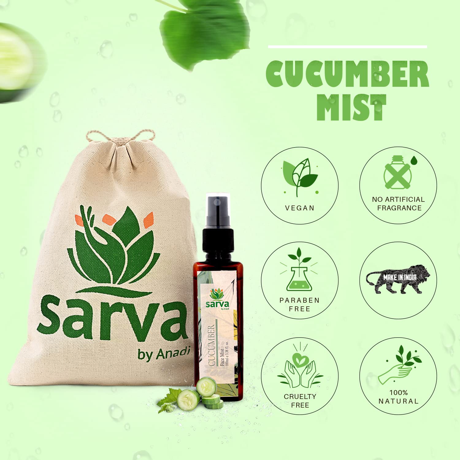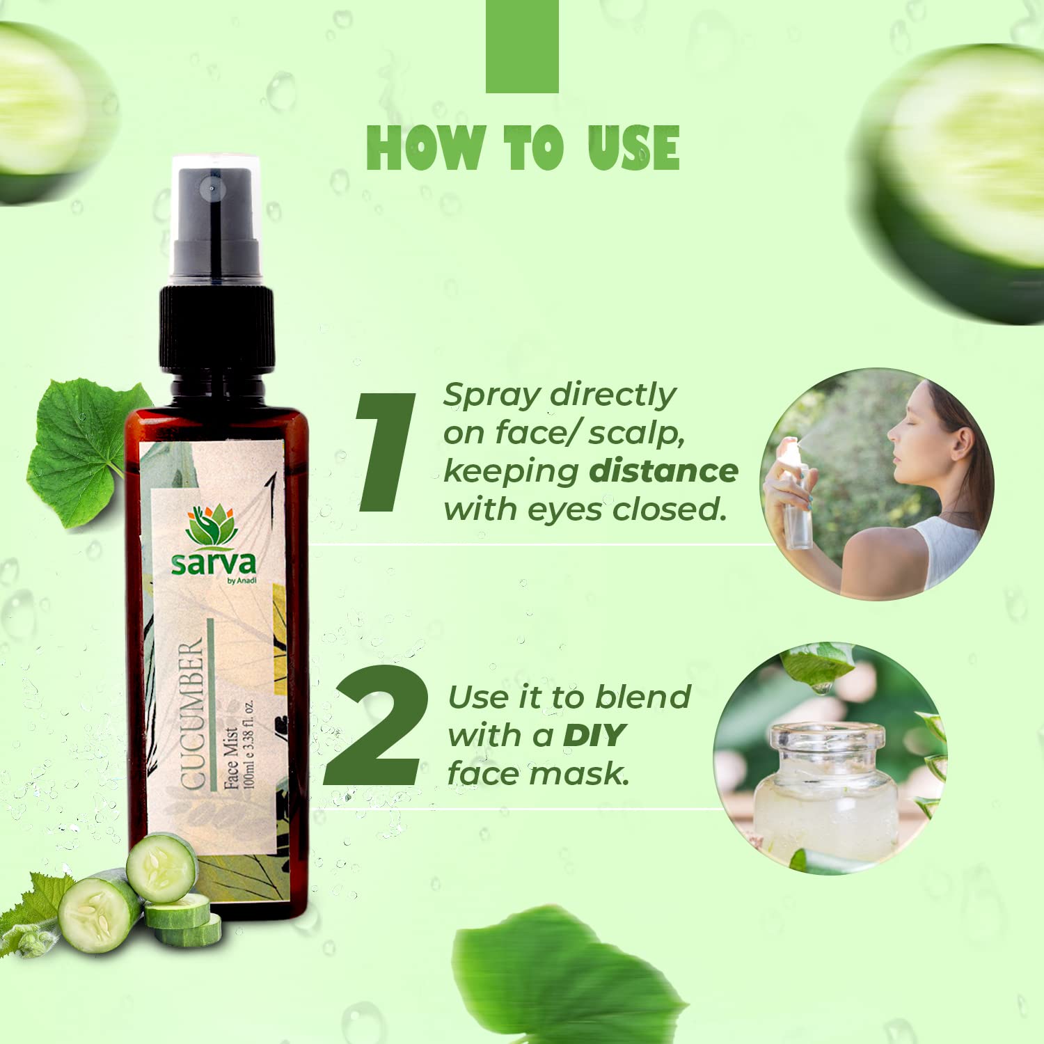 Cucumber Mist Toner from SARVA By AnadiCucumber Mist Is Pure 100% Natural Steam Distilled Hydrosol Which Acts As A Mist And A Great Alternative To Traditional Toners To Your Face And Body. SARVA By Anadi Cucumber Mist Is Produced By The Hydro Distillation Of The Fruit Of Cucumis Sativus. This Hydrating Mist Enhances The Skin Giving It A Healthy Boost Of Freshness And Radiance Maintaining Its PH Balance. Sarva by Anadi represents a collection of pure and natural products originated in India.Size: 100ml e 3.38 fl. Oz.Cucumber Face Mist Caters To Host Of Amazing BenefitsIt Has a Lighter Aroma.Great To Use On A Hot Summer Day.Soothes Damaged Skin Due To Sunburn.It Has A Cooling And Refreshing Effect On The Skin That Can Help With Redness And Inflammation Of The Skin.It Is Also Hydrating On The Skin Allowing Your Skin To Absorb More Moisture To Keep It Feeling Plump And Bouncy.Perfect For Oily Skin As Well As All Skin Types and is a Unisex Product.Directions For UseSpray Directly On Face/Body Keeping A Slight Distance With Eyes Closed.There Is No Need To Dilute The Hydrosols.Keep Your Cucumber Hydrosol Refrigerated For Enhanced Soothing And Refreshing Effect.Use It To Blend With A DIY Face MaskSerums and Moisturizers.Add It To Your Bathwater To Promote Softer Renewed Skin and For A Relaxing Aromatherapy Session.Use Hydrosol To Freshen A Room by Simply Spraying it Within Your Space.ForewarningFor External Use Only. Avoid Contact With Eye.Keep Away From Children Under 3 Years. Do A Patch Test On Skin First.User Discretion Required. Store In Dry Cool Place